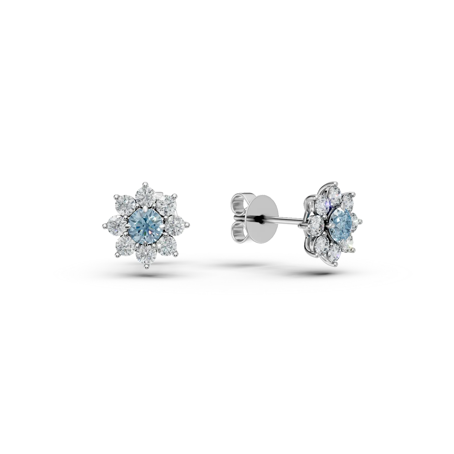 Cercei floare din aur alb cu diamante fancy albastre si diamante incolore de 2.5ct create in laborator