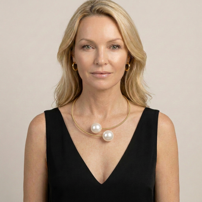 Colier elastic cu terminatie din doua pandante in forma de perle mari rotunde
