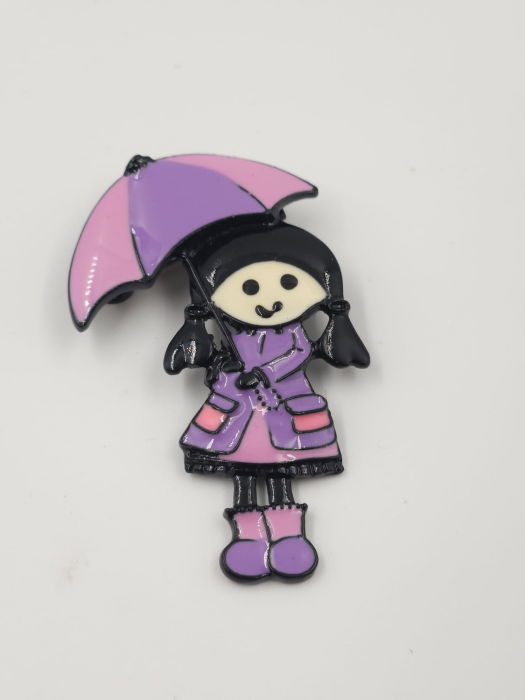 Brosa metalica, fetita cu umbrela in nuante de mov