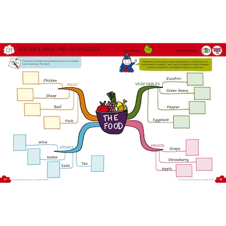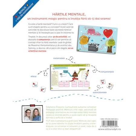 Hartile mentale, un instrument magic pentru a invata fara sa-ti dai seama! Ce este o harta mentala? Cum s-o citesti? Care sunt etapele pentru a o concepe? Caietul de activitati 30 de activitati pentru a deveni un as al hartilor mentale iti dezvaluie toate secretele hartilor mentale si te insoteste pas cu pas in initierea ta. Se adreseaza tuturor copiilor cu varsta peste 6 ani.Treptat, in decursul celor 30 de activitati, vei dezvolta 7 competente care-ti vor permite sa concepi chiar tu harti mentale. Lasa-te ghidat de Maestrul Hartomentalus si de acolitul sau, Sammy, si devino, cat ai pocni din degete, un as al hartilor mentale.Bonus: peste 100 de autocolante.Hartile mentale sunt un atu serios pentru facilitarea invatarii (concentrare, memorare, reflectie). Majoritatea creierelor copiilor apreciaza aceasta combinatie de cuvinte, imagini si conexiuni logice. Este chiar un ajutor pentru dislexie.Harta mentala este utilizata atat pentru a intelege lectiile, pentru a le insusi, cat si pentru a le restabili pe termen lung. De asemenea, este utila in viata de zi cu zi, de exemplu, pentru a prezenta organizarea zilei, o reteta sau regulile vietii de familie.In aceeasi colectie, de aceeasi autori, puteti gasi pe site-ul editurii Didactica Publishing House si urmatoarele produse: „Invat usor la mate – 50 de harti mentale pentru a intelege cu usurinta numararea, calculul, geometria si unitatile de masura – volumul I – clasa pregatitoare, clasa I, clasa a II-a”, „Invat usor la mate – 50 de harti mentale pentru a intelege cu usurinta numaratul, calculul, geometria si masurile – volumul II – clasa a III-a, clasa a IV-a, clasa a V-a”, „Invat usor la franceza – 50 de harti mentale pentru a intelege mai usor gramatica, ortografia, conjugarea verbelor si vocabularul limbii franceze – volumul I – clasa pregatitoare, clasa I, clasa a II-a”, „Invat usor la franceza – 50 de harti mentale pentru a intelege mai usor gramatica, ortografia si conjugarea verbelor – volumul II – clasa a III-a, clasa a IV-a, clasa a V-a”.DESPRE AUTORI:Stephanie Eleaume-Lachaud este autoarea cutiutelor Pedagogie pozitiva. Mamica a trei copii, pasionata de pedagogii alternative, ea concepe astazi harti mentale vesele si colorate pentru a ajuta copiii sa-si recapete dorinta si pofta de a invata!Filf este ilustratoare si graficiana. Mamica a doi copii, ea isi pune talentul in slujba invatarii pentru a binedispune, cu universul ei amuzant si vesel, viata de zi cu zi a celor mici si mari deopotriva!