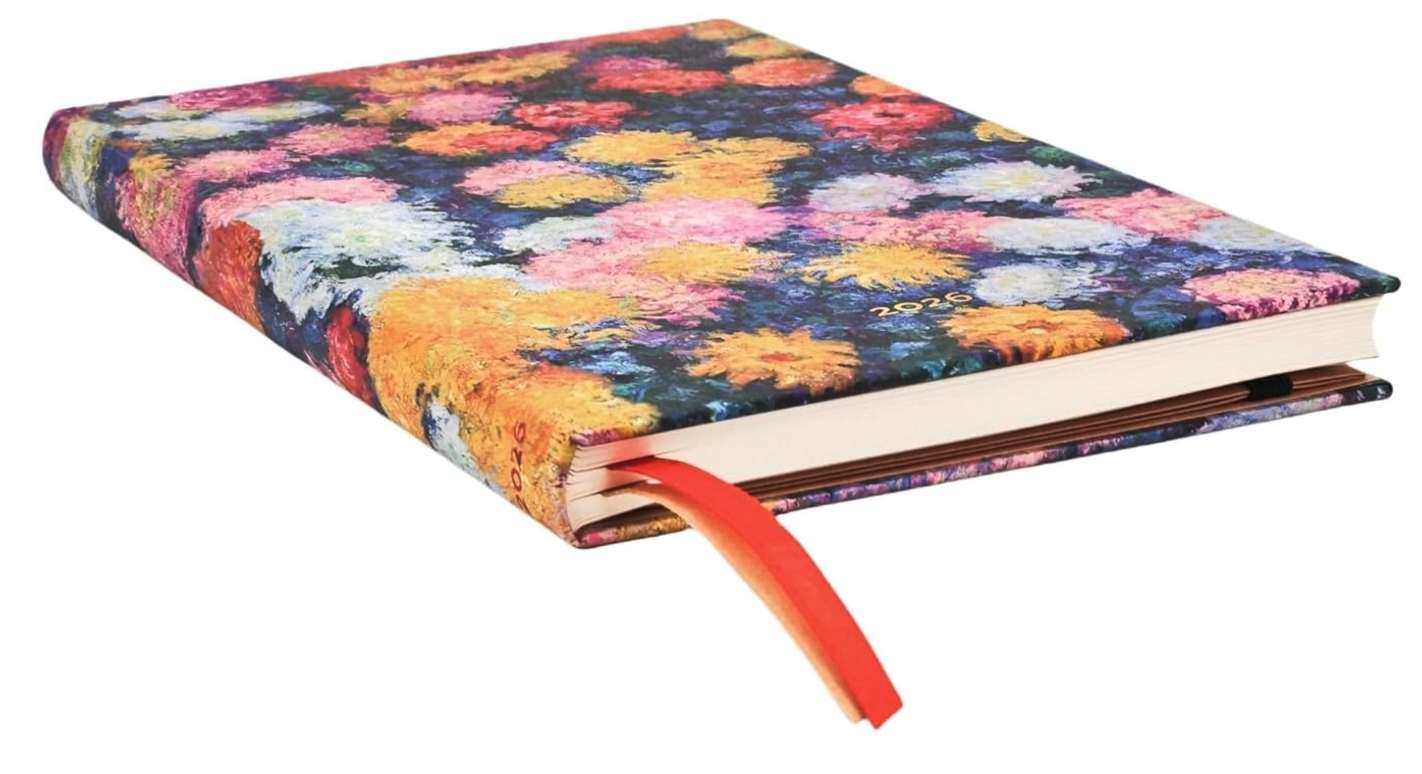Agenda 2026 - Paperblanks - Monets Chrysanthemums - Maxi 12-Month Vertical Hardcover FlexiFrench artist Claude Monet, one of the founders of the Impressionist movement, was particularly fascinated with capturing the transient beauty of nature. In a virtuoso display of flowers, this 1897 work portrays a vibrant bed of chrysanthemums from his prized garden in Giverny.