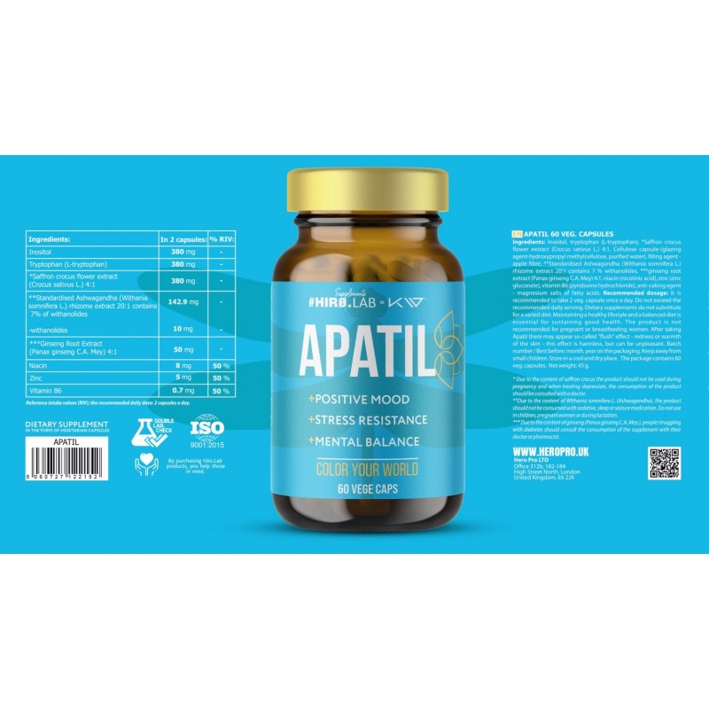 Apatil – 60 Capsule, Hiro Lab Beneficii cheie Apatil Îmbunătățește starea de spirit și susține stabilitatea emoțională Întărește rezistența la stres și promovează relaxarea Conține ingrediente naturale care susțin echilibrul hormonal Stimulează imunitatea și promovează bunăstarea Capsule pe bază de plante, ușor de administrat – potrivite pentru vegani VERIFICĂ STUDIILE: Hiro.Lab x Kamila Wybrańczyk – O nouă versiune a unui produs bestseller Hiro.Lab este încântat să prezinte o nouă versiune de Apatil – un produs care a câștigat recunoaștere și loialitate din partea unei game largi de utilizatori de-a lungul anilor. Acum, în colaborare cu Kamila Wybrańczyk, au fost introduse mai multe modificări care îl fac și mai bun. Este combinația perfectă între o calitate dovedită și o abordare modernă care te sprijină în provocările tale zilnice. Această colaborare combină cunoștințele Kamilei cu experiența Hiro.Lab, permițându-ne să creăm produse adaptate nevoilor femeilor active. Descoperă Pacea și Armonia cu Apatil – Cheia Bunăstării Apatil de la Hiro.Lab de Kamila Wybrańczyk este un supliment unic care ajută la atenuarea stresului zilnic și susține echilibrul emoțional. Datorită unui amestec unic de ingrediente precum extractul de șofran, ashwagandha și ginsengul, Apatil îmbunătățește eficient starea de spirit și crește rezistența la stres – crucial în lumea dificilă de astăzi. Pentru cei care se luptă cu responsabilități excesive, Apatil oferă un sprijin fiabil în menținerea calmului și a concentrării. Acest supliment susține echilibrul natural al organismului, ajutând la menținerea unei perspective pozitive asupra vieții și la îmbunătățirea bunăstării generale. Cu Apatil, te poți simți mai relaxat, dar plin de energie, pregătit să înfrunți provocările de zi cu zi. Rezistență la stres și echilibru mental cu Apatil Atunci când te confrunți cu provocările zilnice, Apatil de la Hiro.Lab de Kamila Wybrańczyk devine aliatul tău. Datorită adaptogenelor precum ashwagandha și ginsengul, Apatil ajută organismul să combată stresul. Aceste ingrediente naturale au fost mult timp apreciate pentru proprietățile lor calmante, susținând echilibrul hormonal și reducând simptomele stresului. Adaosul de triptofan, un aminoacid care susține producția de serotonină, ajută la reglarea stării de spirit și la promovarea sentimentelor de calm, în timp ce extractul de șofran, un antioxidant puternic, ajută la îmbunătățirea stării de spirit și susține sănătatea mintală. Dacă simți că stresul îți acaparează viața, Apatil este soluția perfectă pentru a restabili pacea și armonia mentală. Utilizarea regulată a Apatil aduce beneficii pe termen lung, îmbunătățind calitatea vieții și capacitatea de a face față provocărilor. Suport natural pentru mintea și corpul tău Apatil, îmbogățit cu niacină și vitamina B6, susține buna funcționare a sistemului nervos, care este crucială pentru menținerea sănătății mintale. În plus, zincul din supliment întărește sistemul imunitar, protejând împotriva infecțiilor și bolilor. Apatil este un supliment complet conceput pentru a-ți oferi sănătate, pace și armonie în fiecare zi. Dacă dorești să-ți îmbunătățești bunăstarea și să-ți consolidezi rezistența la stres, Apatil de la Hiro.Lab by Kamila Wybrańczyk este soluția pe care o cauți. Încearcă Apatil astăzi și descoperă puterea ingredientelor naturale în combaterea stresului și a tensiunii. Nu amâna - începe să ai grijă de sănătatea ta mintală și fizică acum! Porție: 2 capsule Prospect Apatil: Instrucțiuni de utilizare Apatil: Luați 2 capsule o dată pe zi. Porții per recipient: 30 Pachet: 60 capsule Ingrediente Apatil: Inozitol, triptofan (L-triptofan), *extract de flori de șofran (Crocus sativus L.) 4:1, capsulă de celuloză (agent de glazurare – hidroxipropilmetilceluloză, apă purificată), agent de încărcare – fibre de măr, **extract standardizat 20:1 de rizom de ashwagandha (Withania somnifera L.) care conține 7% withanolide, ***extract de rădăcină de ginseng (Panax ginseng C.A. Mey) 4:1, niacină (acid nicotinic), zinc (gluconat de zinc), vitamina B6 (clorhidrat de piridoxină), agent antiaglomerant – săruri de magneziu ale acizilor grași. Supliment alimentar. Acest produs nu este destinat să diagnosticheze, să trateze, să vindece sau să prevină nicio boală. Ingrediente (VNR) per 2 capsule Inozitol 380 mg Triptofan (L-triptofan) 380 mg *Extract de flori de șofran (Crocus sativus L.) 4:1 380 mg **Extract standardizat de rizom de Ashwagandha 20:1 (Withania somnifera L.) conținând 7% withanolide 142,9 mg Withanolide 10 mg ***Extract de rădăcină de ginseng (Panax ginseng C.A. Mey) 4:1 50 mg Niacină 8 mg 50% Zinc 5 mg 50% Vitamina B6 0,7 mg 50% *Datorită conținutului de șofran, acest produs nu trebuie utilizat de femeile însărcinate sau în tratamentul depresiei. Consultați medicul înainte de a utiliza acest produs. **Datorită conținutului de Ashwagandha, acest produs nu trebuie utilizat de persoanele care iau sedative, somnifere sau medicamente antiepileptice, precum și de copii, femei însărcinate sau care alăptează.***Datorită conținutului de ginseng (Panax ginseng C.A. Mey.), persoanele cu diabet zaharat nu trebuie să utilizeze acest produs.** Suplimentele alimentare nu trebuie utilizate ca înlocuitor pentru o dietă variată. Rețineți că doar un stil de viață sănătos și o nutriție echilibrată asigură funcționarea corectă a organismului și o sănătate bună. Nu depășiți doza zilnică recomandată. Acest produs nu trebuie utilizat de către persoane alergice la oricare dintre ingredientele sale. Nu este recomandat femeilor însărcinate sau care alăptează. A nu se lăsa la îndemâna copiilor mici. A se păstra la îndemâna copiilor mi