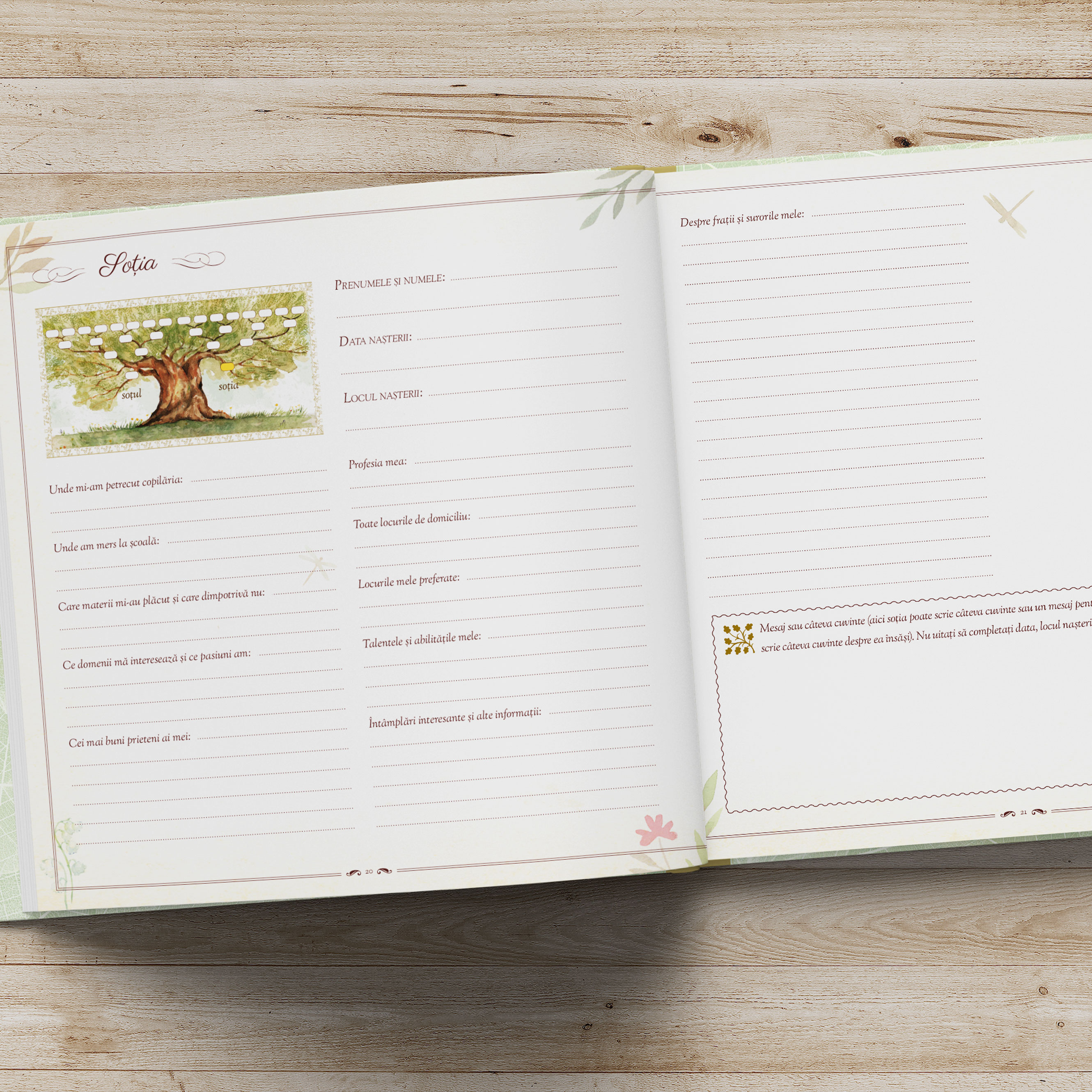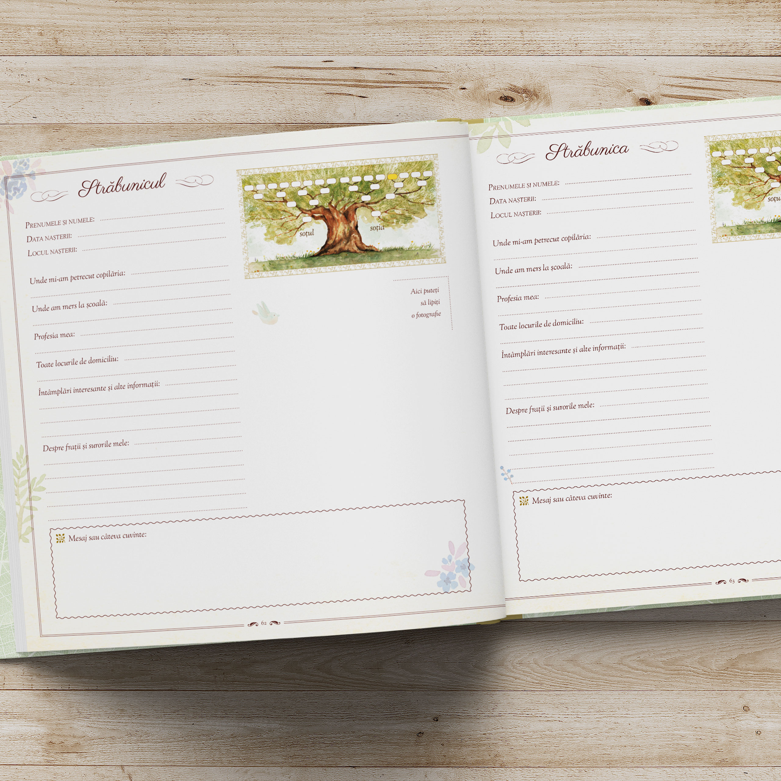 Arborele genealogic al familiei noastre este o carte pe care o puteti oferi drept cadou si care suprinde istoria intregii familii, inclusiv un arbore genealogic mare, clar ilustrat. Cartea este foarte ingenios conceputa, astfel incat sa va puteti include cu usurinta stramosii pana la a cincea generatie, precum si toti descendentii. Pentru fiecare membru al familiei, puteti adauga informatii interesante despre el si despre viata sa, inclusiv o fotografie. De asemenea, puteti ruga una dintre rudele dvs. sa scrie in carte un mesaj ca amintire – pentru dvs. si copiii dvs. Va puteti orienta usor prin carte, intrucat este asemeni unui mare atlas de familie. Ilustratiile frumoase confera cartii atmosfera potrivita de unitate familiala si respect pentru radacinile noastre.Va puteti orienta usor prin carte, intrucat este asemeni unui mare atlas de familie. Ilustratiile frumoase confera cartii atmosfera potrivita de unitate familiala si respect pentru radacinile noastre.„Multi oameni m-au intrebat daca ar fi posibil sa creez o carte care sa surprinda istoria intregii familii, inclusiv un arbore genealogic frumos si clar ilustrat. Nu a fost o sarcina usoara, dar cred ca am reusit. Voi fi fericita daca aceasta carte va deveni o inspiratie pentru reuniunile de familie si cercetarea istoriei familiei”, spune Monika Koprivova, autoarea cartilor de succes Bunico, povesteste-mi si Bunicule, povesteste-mi.Cartea are 128 de pagini, un format mare de 30 x 30 cm, hartie de calitate si, datorita aspectului sau notabil, poate servi drept cadou unic pentru Craciun, nunti, zile de nastere si alte ocazii importante.