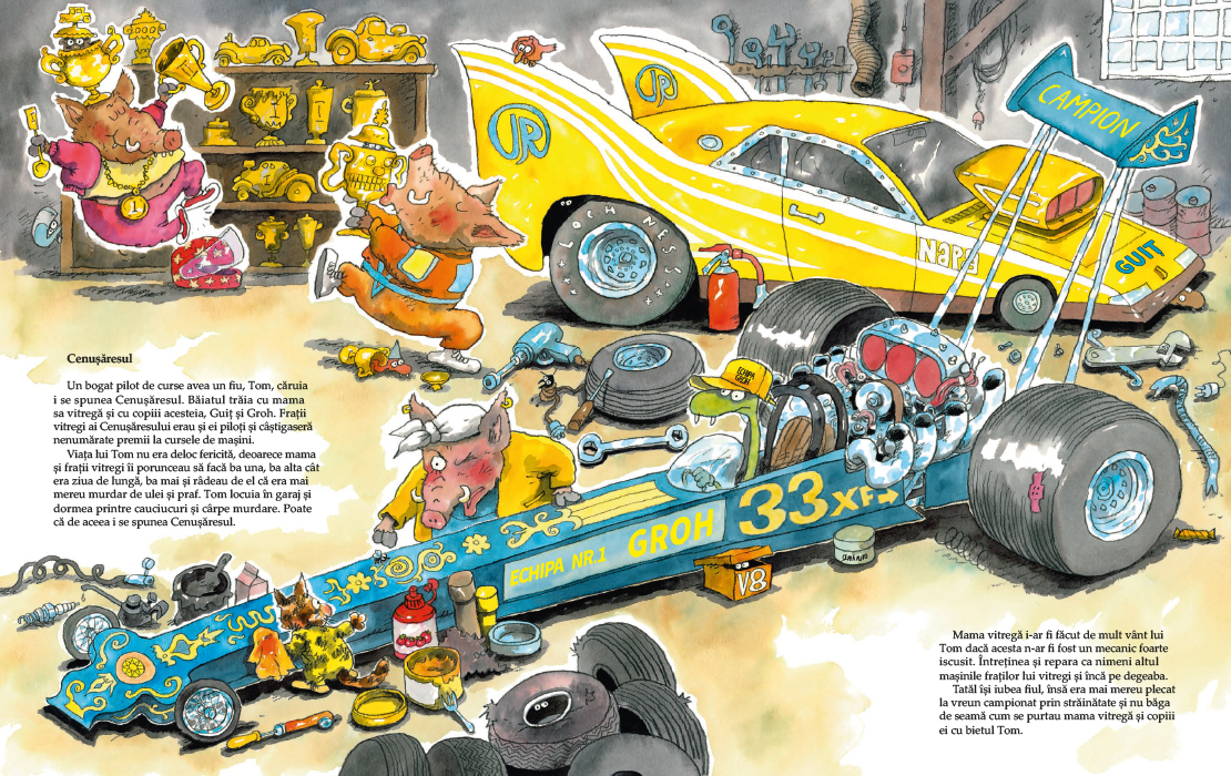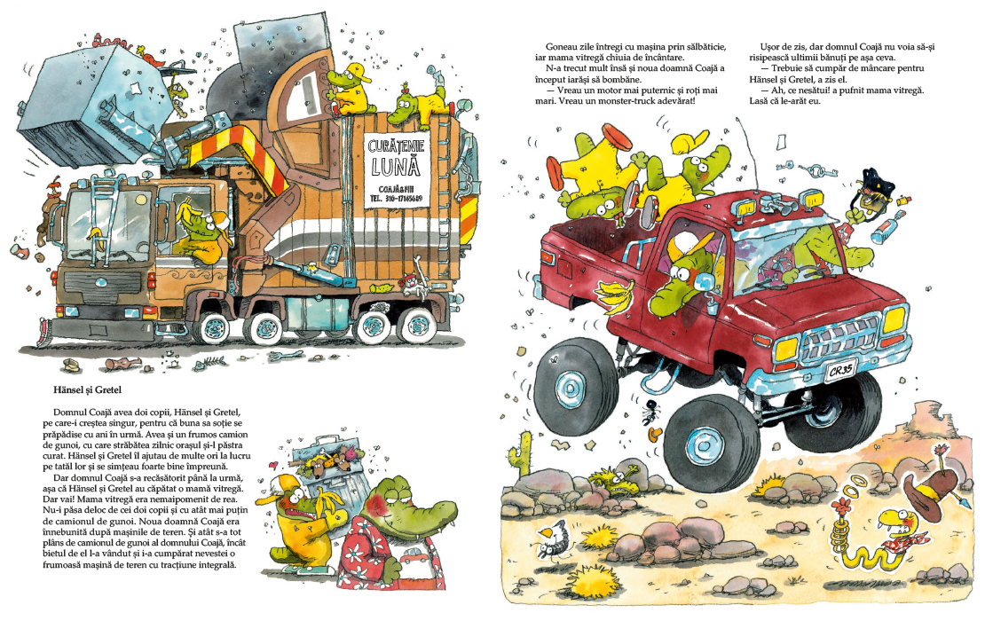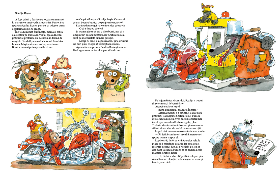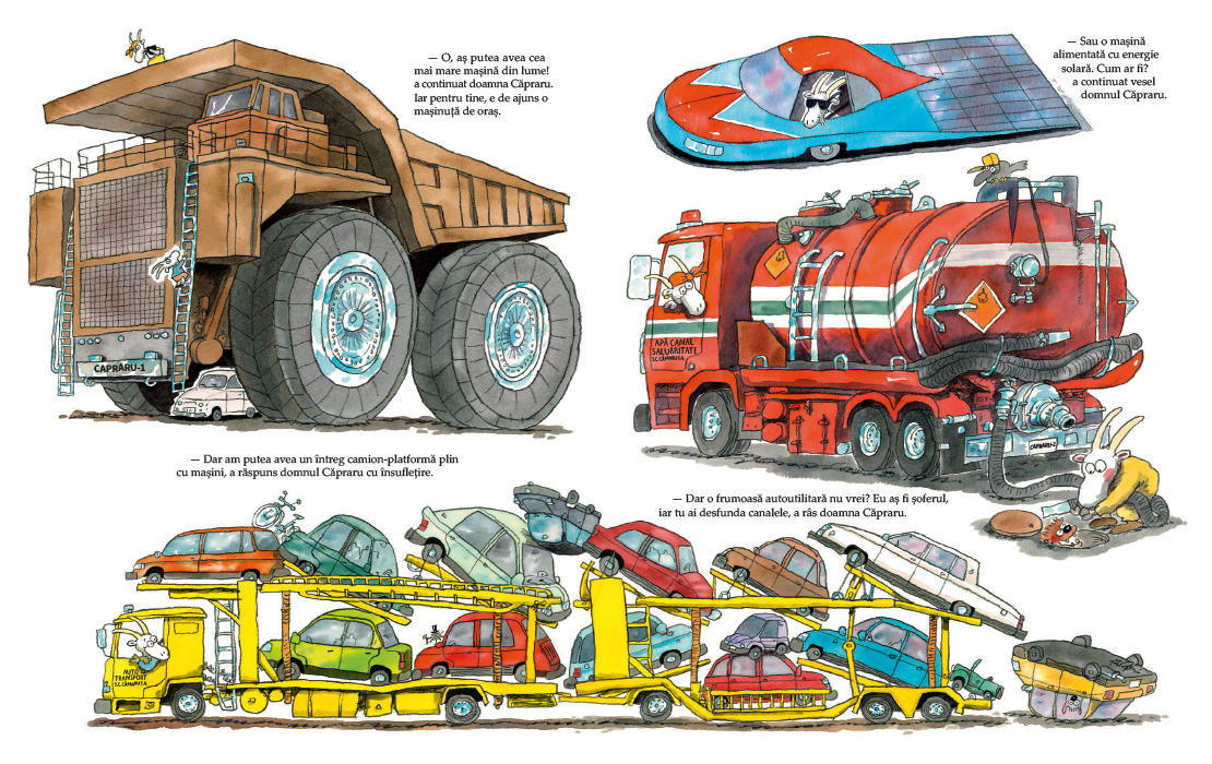 Camioane, furgonete, masini de teren, masini de pompieri, autobuze, macarale, motociclete, betoniere, masini de curse, masini electrice...Tot felul de vehicule, reale sau imaginare, au fost create cu fantezie si umor de celebrul Mauri Kunnas pentru a repovesti, spre incantarea tuturor copiilor pasionati de masini, cateva dintre cele mai cunoscute basme.