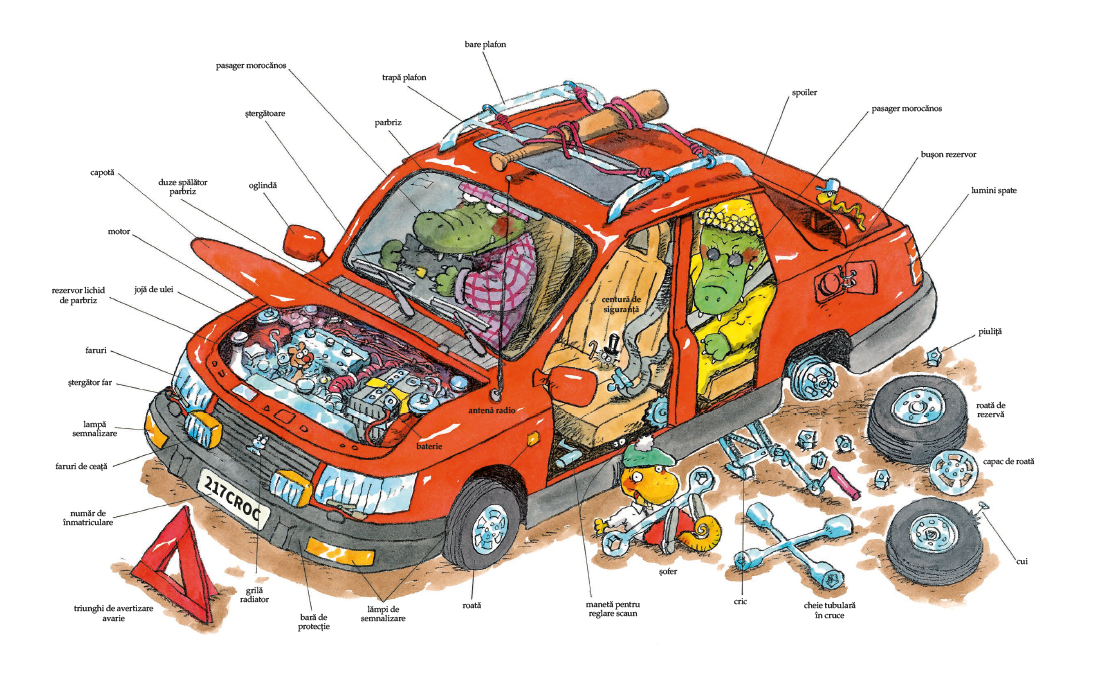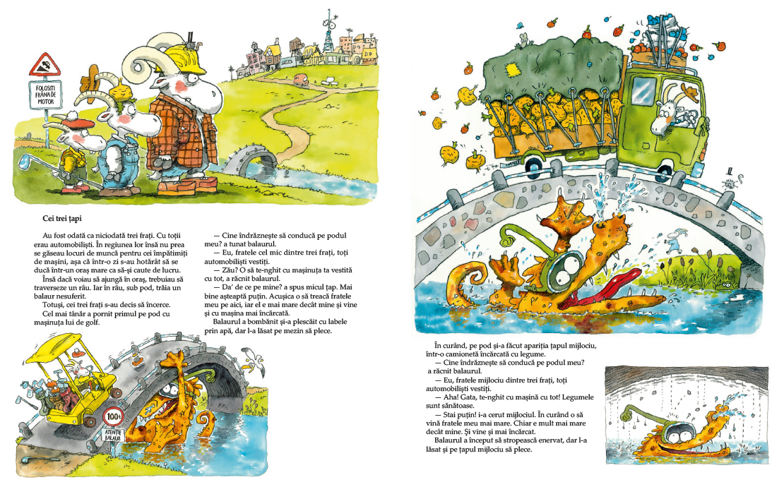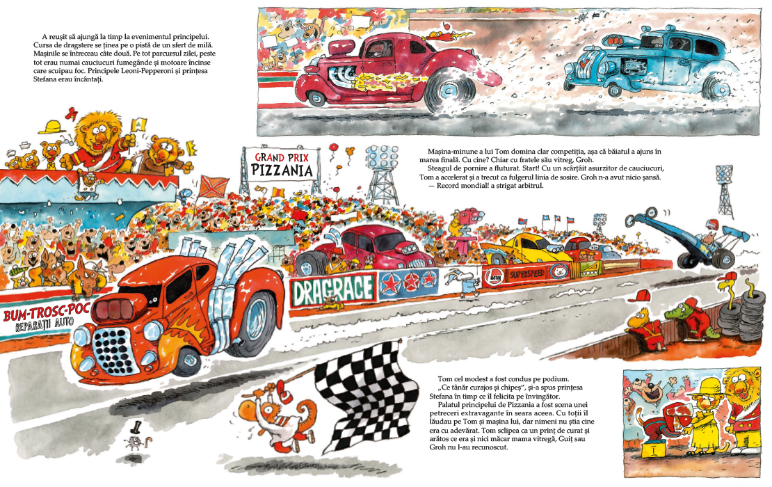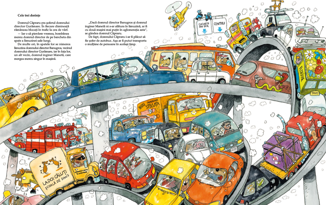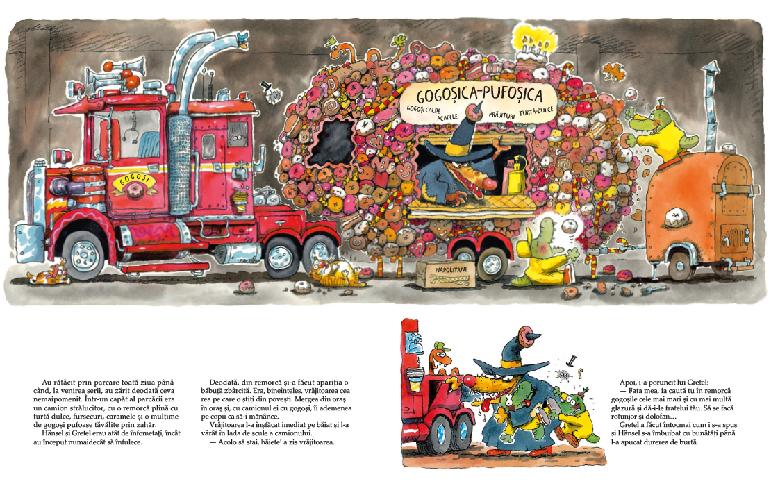 Camioane, furgonete, masini de teren, masini de pompieri, autobuze, macarale, motociclete, betoniere, masini de curse, masini electrice...Tot felul de vehicule, reale sau imaginare, au fost create cu fantezie si umor de celebrul Mauri Kunnas pentru a repovesti, spre incantarea tuturor copiilor pasionati de masini, cateva dintre cele mai cunoscute basme.