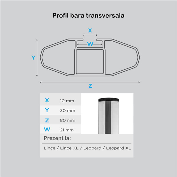 Bare transversale portbagaj Menabo Lince Silver compatibile cu Suzuki Swace 2020+ Bare transversale din aluminiu Menabo Lince Silver va ofera o flexibilitate sporita in transportarea bagajelor datorita capacitatii de incarcare de 90 kg, dar si a canalului standard pentru prindere cu profil T a diferitelor accesorii. Barele au sectiune aerodinamica de 8 cm si se potrivesc pentru toate tipurile de portbagaje (cutii portbagaj, suport bicicleta, suport schi, portbagaj caiac/canoe, etc.). Profilul aerodinamic in forma de aripa al barelor transversale ajuta la minimalizarea zgomotului si reduce rezistenta aerodinamica. Setul de bare transversale cuprinde toate elementele necesare pentru montarea pe barele longitudinale de tip sina (integrate) ale autoturismului. Sistemul de bare portbagaj cuprinde: - 2 x Bare transversale din aluminiu - 4 x Sisteme de prindere pe barele longitudinale - 4 x Sisteme antifurt + Chei - 1 x Cheie imbus (nu este necesara o alta unealta) Specificatii tehnice: - Lungime bara: 1200 mm - Inaltime bara: 30 mm - Latime bara: 80 mm - Greutate sistem: 3,9 kg - Material: aluminiu - Canal 20 mm pentru prindere T pe toata lungimea barei - Sistem antifurt: Da - Capacitate maxima incarcare: 90 kg - Aprobate TUV & ISO/PAS 11154:2006 Video montaj Menabo Lince Silver Filmuletele si pozele sunt cu titlu de prezentare. Pentru in montaj corect si rapid, folositi manualul de instructiuni inclus in pachet. Greutatea maxima de incarcare poate sa fie diferita in functie de marca si modelul masinii. Consultati caracteristicile tehnice date de producatorul autoturismului.