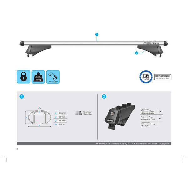 Bare transversale portbagaj Menabo Tiger Silver compatibile cu Renault Kadjar 2015+ Bare transversale din aluminiu Menabo Tiger Silver va ofera o flexibilitate sporita in transportarea bagajelor datorita capacitatii de incarcare de 75 kg, dar si a canalului standard pentru prindere cu profil T a diferitelor accesorii. Barele au sectiune aerodinamica si se potrivesc pentru toate tipurile de portbagaje (cutii portbagaj, suport bicicleta, suport schi, portbagaj caiac/canoe, etc.). Profilul aerodinamic oval al barelor transversale ajuta la minimalizarea zgomotului si reduce rezistenta aerodinamica. Setul de bare transversale cuprinde toate elementele necesare pentru montarea pe barele longitudinale de tip sina (integrate) ale autoturismului. Sistemul de bare portbagaj cuprinde: - 2 x Bare transversale din aluminiu - 4 x Sisteme de prindere pe barele longitudinale (preasamblate) - 1 x Cheie imbus (nu este necesara o alta unealta) Specificatii tehnice: - Lungime bara: 1200 mm - Inaltime bara: 28 mm - Latime bara: 48 mm - Greutate sistem: 3,9 kg - Material: aluminiu - Canal 20 mm pentru prindere T pe toata lungimea barei - Sistem antifurt: Da - Capacitate maxima incarcare: 75 kg - Culoare bara: Gri - Testate TUV si ISO/PAS 11154:2006 (clauses 5.2.5, 5.3.5) - In conformitate cu DIN 75302 Video montaj Menabo Tiger Silver Filmuletele si pozele sunt cu titlu de prezentare. Pentru in montaj corect si rapid, folositi manualul de instructiuni inclus in pachet. Greutatea maxima de incarcare poate sa fie diferita in functie de marca si modelul masinii. Consultati caracteristicile tehnice date de producatorul autoturismului.