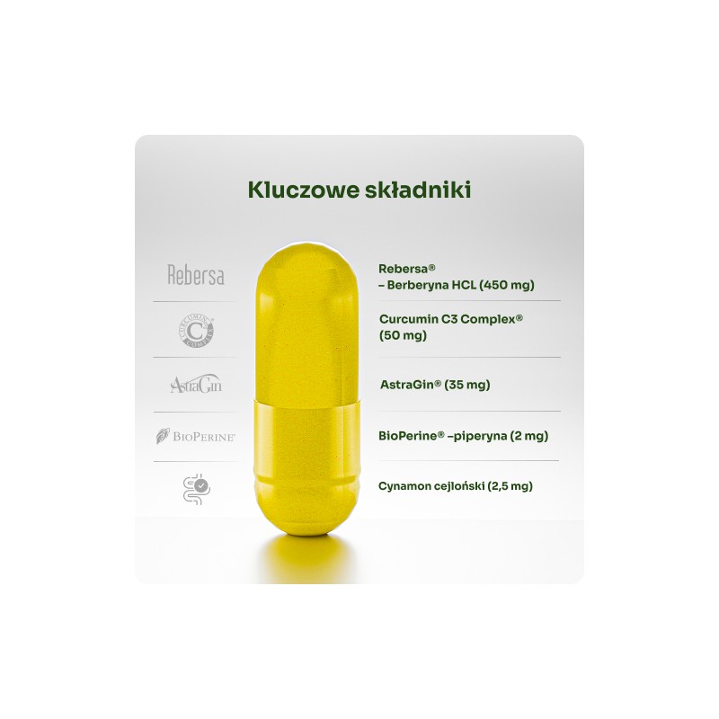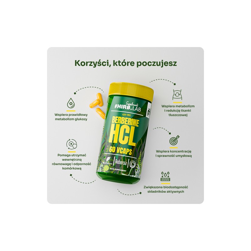 Berberine HCL – 60 Capsule, Hiro Lab Suport pentru metabolismul glucozei și o greutate corporală sănătoasă Rebersa® – 97% clorhidrat de berberină – cea mai înaltă calitate și puritate a ingredientului Suport pentru funcția organismului în perioadele de stres crescut – datorită extractelor naturale de plante BioPerine® și complexul Curcumin C3® – biodisponibilitate avansată a ingredientelor AstraGin® – suport eficient pentru absorbția nutrienților Hiro.Lab Berberine HCL 450mg (60 capsule) este un supliment alimentar modern pe bază de plante, care combină ingrediente de înaltă calitate pentru susținerea metabolismului și a sănătății generale. Beneficii Susținerea metabolismului: Ajută la reglarea nivelului de zahăr din sânge și la susținerea metabolismului glucozei Sănătatea cardiovasculară: Poate contribui la reducerea nivelului de colesterol rău LDL și a trigliceridelor Acțiune antioxidantă: Adăugarea Curcumin C3 Complex® oferă proprietăți antioxidante puternice. Susținerea sistemului imunitar: Prezența AstraGin® și BioPerine® îmbunătățește absorbția nutrienților și susține sistemul imunitar. Mod de administrare: 1 capsulă pe zi, de preferat în timpul mesei. Nu depășiți doza zilnică recomandată. Ingredients Rebersa® (extract din Berberis aristata): 450mg (echivalent cu 97% berberină HCL). Curcumin C3 Complex®: 50mg (extract de turmeric cu 95% curcuminoide). AstraGin®: 35mg (ajută la absorbția nutrienților). BioPerine®: 2mg (extract de piper negru care crește biodisponibilitatea). Scorțișoară (Cinnamomum cassia): 2,5mg (extract cu proprietăți antioxidante). Precauții Nu depășiți doza zilnică recomandată. A se păstra departe de copiii mici. Produsul se păstrează într-un loc răcoros și uscat. Suplimentele alimentare nu trebuie utilizate ca substitut pentru o dietă echilibrată. Acest produs nu este destinat prevenirii, tratamentului sau vindecării bolilor la om. Consultați medicul dumneavoastră dacă sunteți însărcinată, alăptați, urmați un tratament medicamentos sau aveți probleme de sănătate. Listele cu ingrediente pot fi modificate sau actualizate periodic. Consultați lista ingredientelor de pe ambalajul produsului pe care îl primiți pentru cea mai actualizată listă de ingrediente. Nu se administrează în caz de hipersensibilitate la oricare dintre ingredientele conținute.