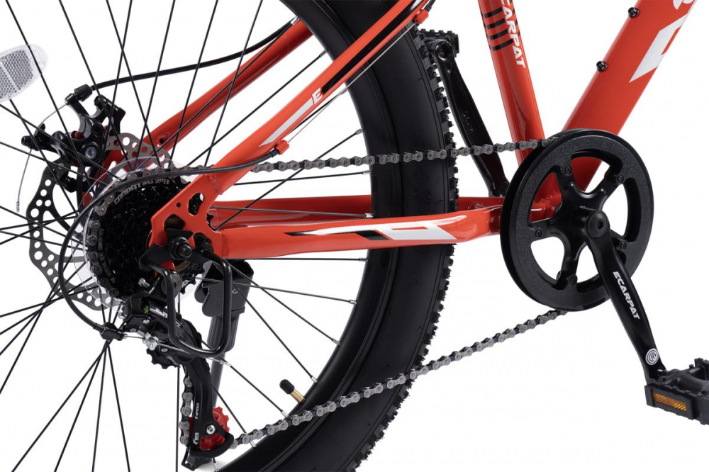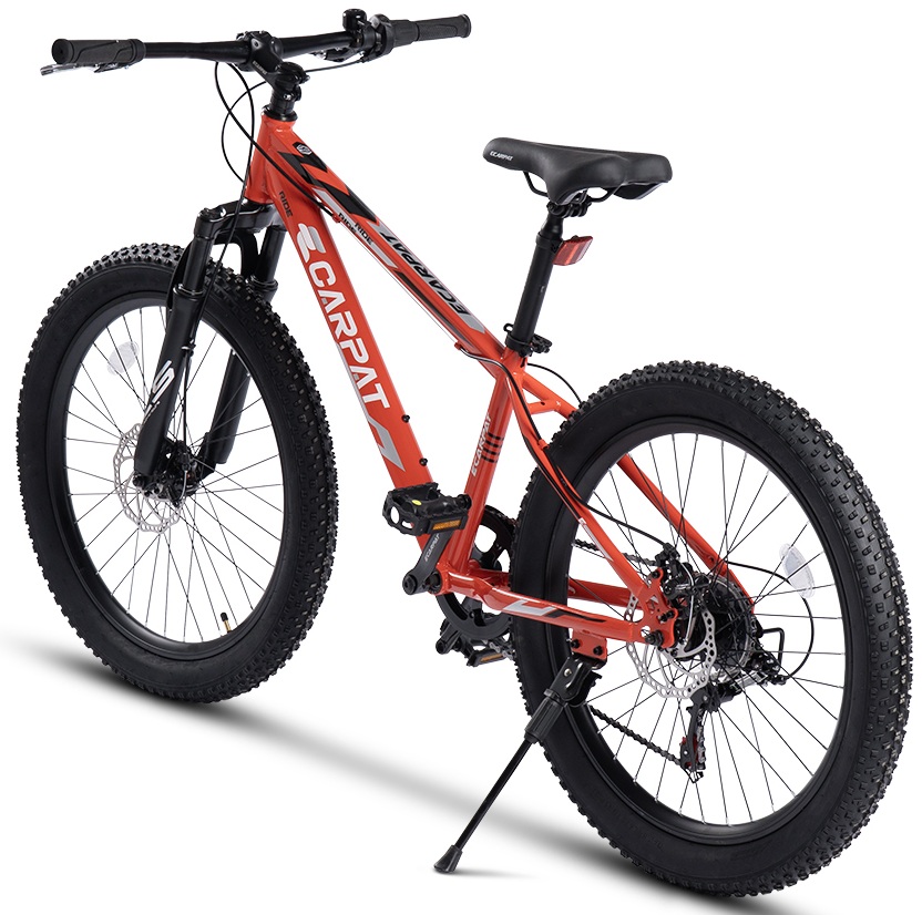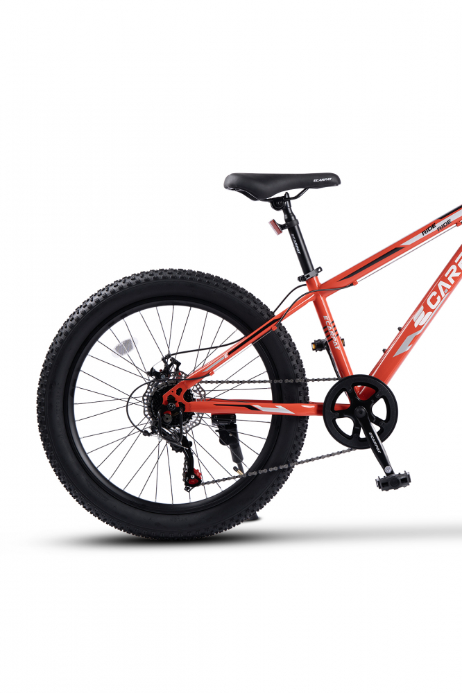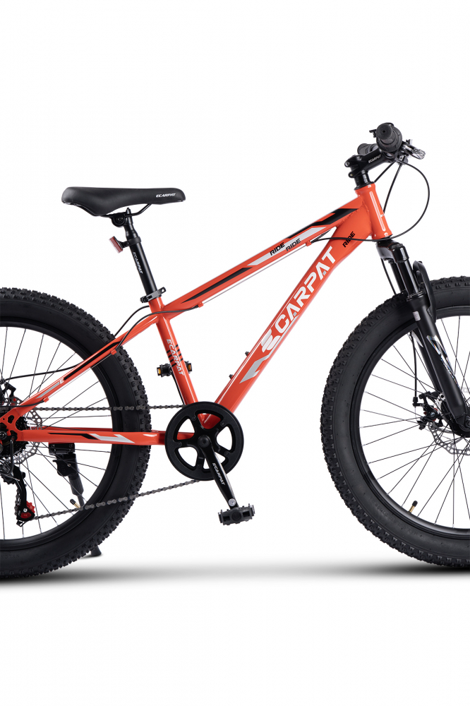 Bicicleta Copii ECARPAT RIDE S24109C 24quot, Echipare Shimano, Anvelope Late 24x3.0, Furca cu Suspensie, Frane Disc, 7 Viteze, PortocaliuAnvelope late - datorita acestora circula in zonele de teren cu