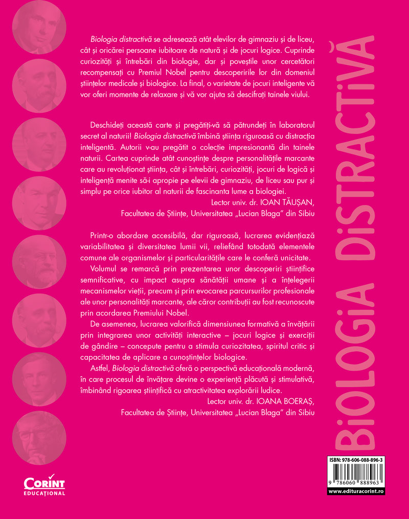 #html-body [data-pb-style=UAXT9YJ]{justify-content:flex-start;display:flex;flex-direction:column;background-position:left top;background-size:cover;background-repeat:no-repeat;background-attachment:scroll}Deschideți această carte și pregătiți-vă să pătrundeți în laboratorul secret al naturii! Biologia distractivă îmbină știința riguroasă cu distracția inteligentă. Autorii v-au pregătit o colecție impresionantă din tainele naturii. Cartea cuprinde atât cunoștințe despre personalitățile marcante care au revoluționat știința, cât și întrebări, curiozități, jocuri de logică și inteligență menite să-i apropie pe elevii de gimnaziu, de liceu sau pur și simplu pe orice iubitor al naturii de fascinanta lume a biologiei.nLector univ. dr. IOAN TĂUȘAN,nFacultatea de Științe, Universitatea „Lucian Blaga” din Sibiu Printr-o abordare accesibilă, dar riguroasă, lucrarea evidențiază variabilitatea și diversitatea lumii vii, reliefând totodată elementele comune ale organismelor și particularitățile care le conferă unicitate.nVolumul se remarcă prin prezentarea unor descoperiri științifice semnificative, cu impact asupra sănătății umane și a înțelegerii mecanismelor vieții, precum și prin evocarea parcursurilor profesionale ale unor personalități marcante, ale căror contribuții au fost recunoscute prin acordarea Premiului Nobel.nDe asemenea, lucrarea valorifică dimensiunea formativă a învățării prin integrarea unor activități interactive – jocuri logice și exerciții de gândire – concepute pentru a stimula curiozitatea, spiritul critic și capacitatea de aplicare a cunoștințelor biologice.nAstfel, Biologia distractivă oferă o perspectivă educațională modernă, în care procesul de învățare devine o experiență plăcută și stimulativă, îmbinând rigoarea științifică cu atractivitatea explorării ludice.nLector univ. dr. IOANA BOERAȘ,nFacultatea de Științe, Universitatea „Lucian Blaga” din Sibiu