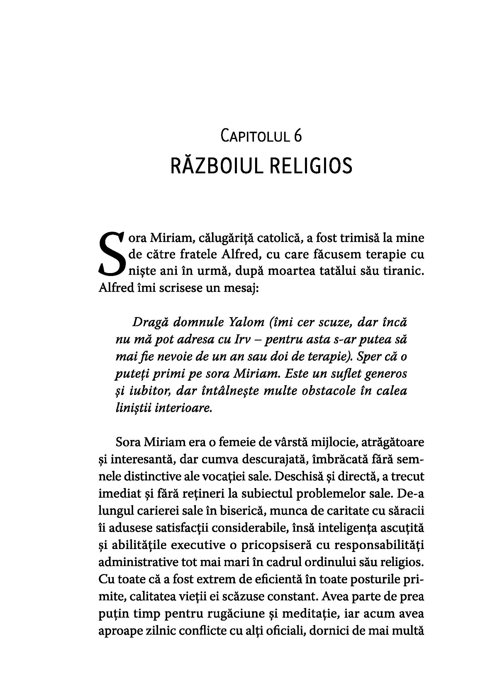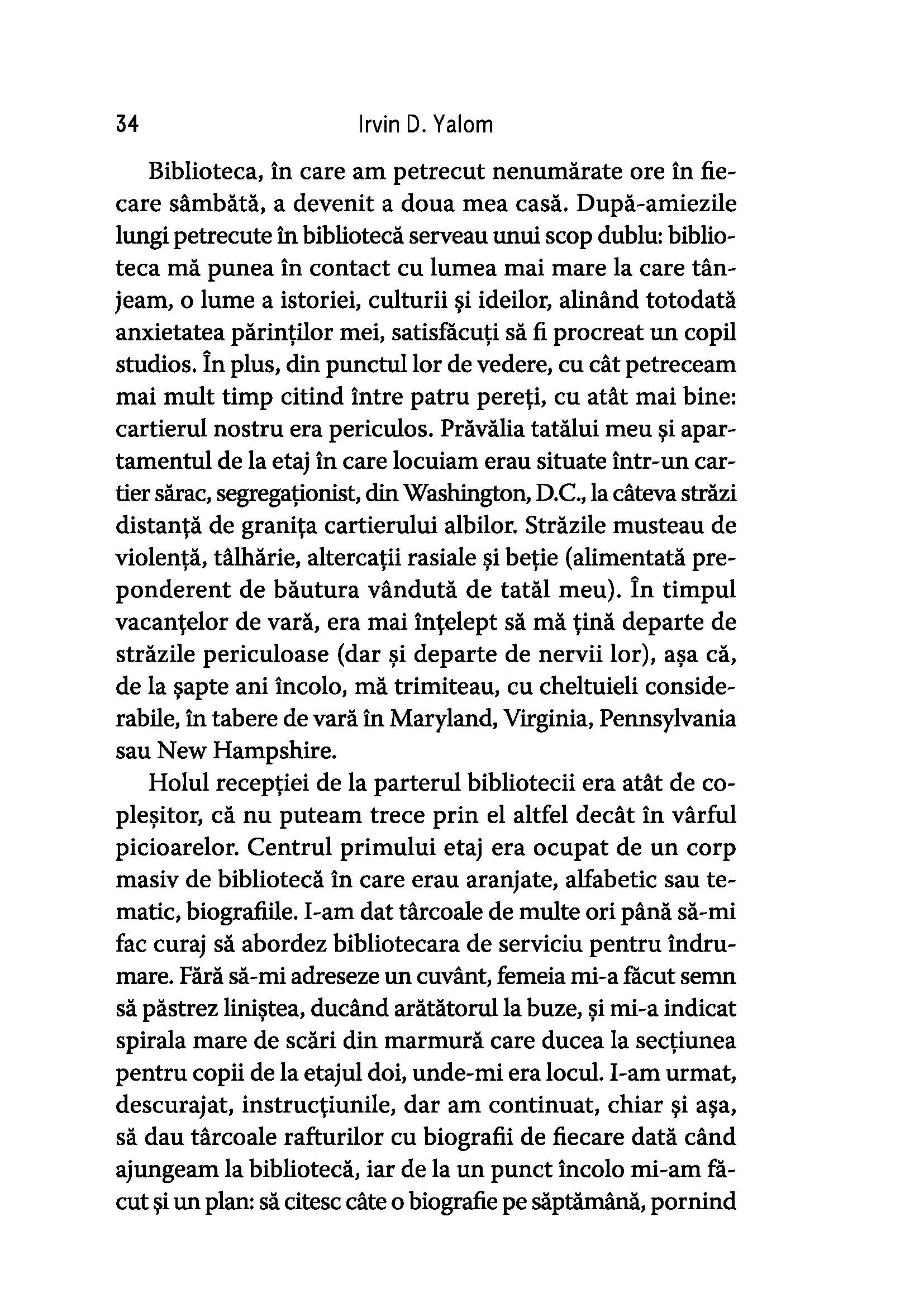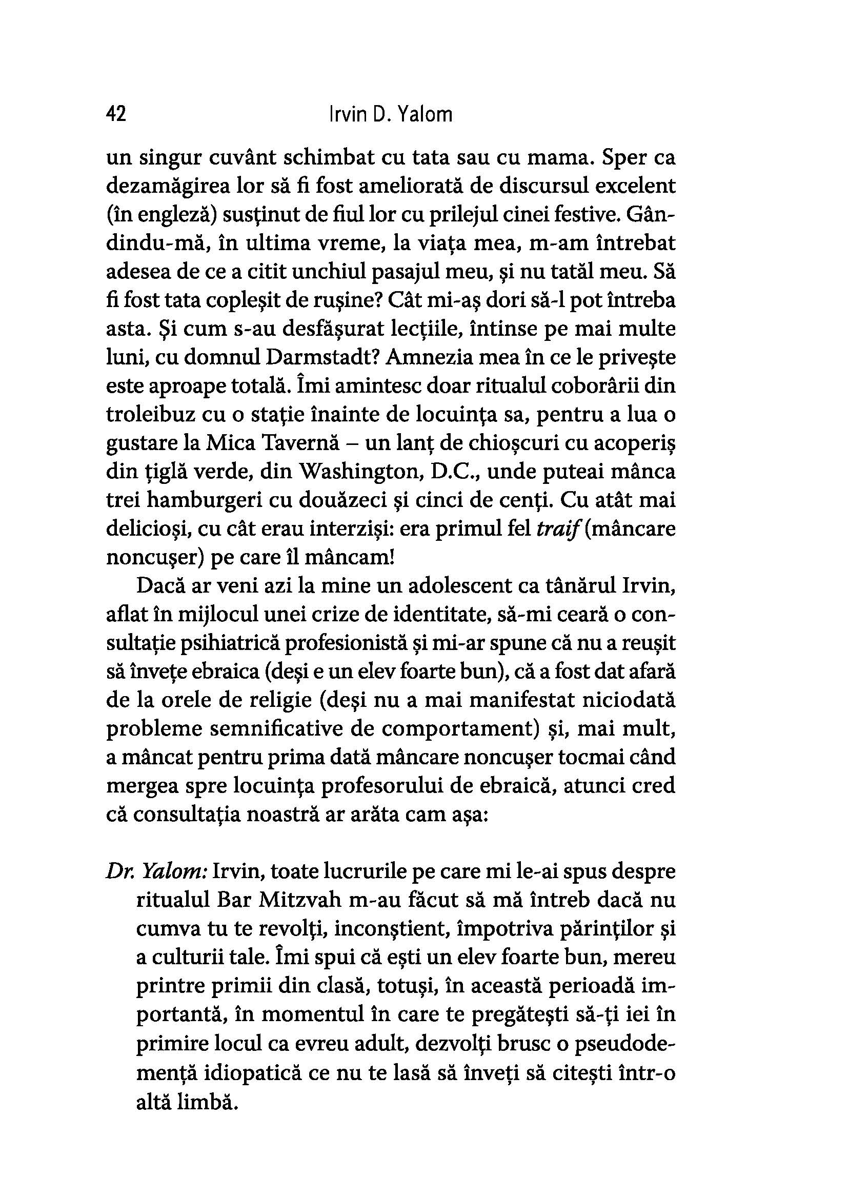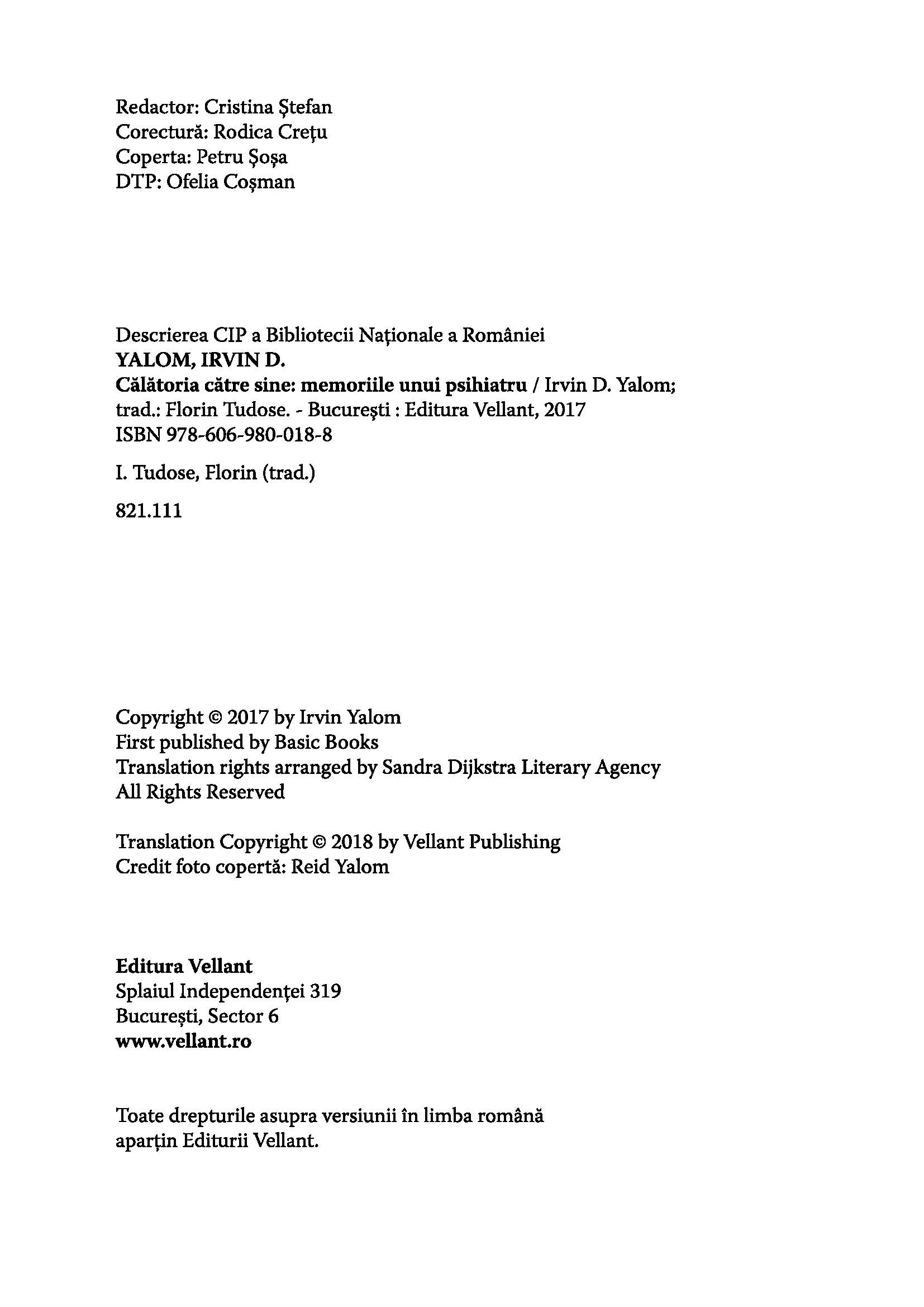 Daca psihoterapia ne da sansa unei ,,existente examinate”, atunci volumul autobiografic - Calatoria catre sine - al lui Irvin D. Yalom ne ofera ceva in plus. Imaginea de cealalta parte a oglinzii, parcursul psihoterapeutului, cu incercarile, cu punctele de cotitura, iubirile si indoielile, dar si momentele de ,,Evrika!”. Yalom se dezvaluie cititorului prin acest demers introspectiv curajos si profund umanist: psihiatrul, asemeni tuturor, traverseaza aceleasi distante in drumul catre sine.,,Sunt un incepator al varstei de optzeci si cinci de ani. Uneori accept ideea ca batranetea ar trebui sa fie un timp de odihna, liniste si reflectare impacata. Totodata, stiu ca inca mai exista sentimente turbulente din tineretea mea care continua sa ameninte ca vor iesi la suprafata imediat ce incetinesc ritmul. Am citat mai devreme cuvintele lui Dickens: „Intrucat, apropiindu‑ma de‑acum tot mai mult de sfarsit, ma deplasez intr‑un cerc tot mai aproape de inceput.“ Sunt cuvinte care ma bantuie. Simt tot mai mult fortele care ma trag inapoi spre inceputurile mele.”Irvin D. YalomIrvin D. Yalom este profesor emerit de psihiatrie la Universitatea Stanford si practica psihiatria in San Francisco si Palo Alto. Impreuna cu sotia sa, Marilyn, are patru copii si sapte nepoti. Locuieste in Palo Alto, California.