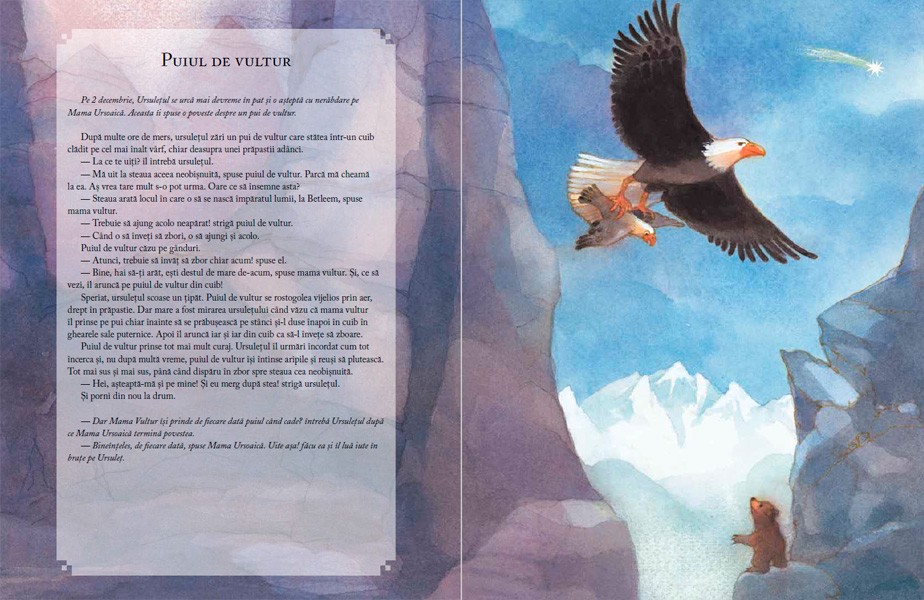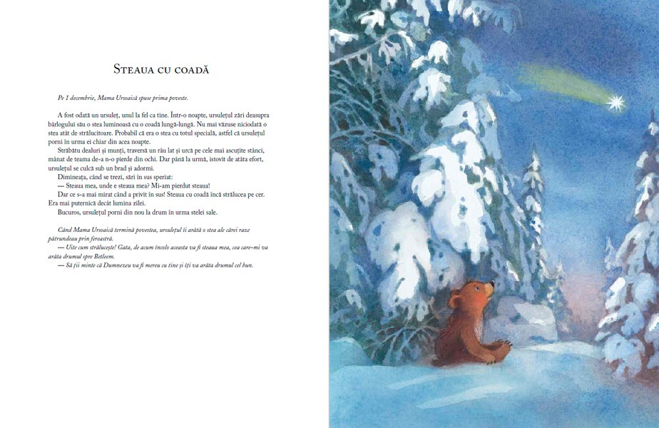 Cu mult inainte de primele zile din decembrie, magazinele sunt deja pline de decoratiuni, dulciuri si alte produse de Craciun. Ce putem face, impreuna cu copiii nostri, pentru a incetini cumva aceasta graba, pentru a trece peste tentatiile insistente ale ofertelor comerciale de toate felurile in speranta de a descoperi sensurile mai adanci ale sarbatorii? Cum ne putem bucura, ramanand cu amintirea durabila a unor clipe fericite petrecute in familie, de zilele de inceput de iarna care trec in asteptarea Craciunului? Poate ca tot povestile sunt cea mai potrivita solutie, ca de atatea ori.Sa citim povesti impreuna cu copiii este exact ce ne indeamna aceasta carte. Personajul principal este un ursulet care, ca orice copil, se intreaba nerabdator cand va veni Craciunul. Ca asteptarea sa-i fie mai usoara, mama ursoaica ii spune in fiecare zi, incepand cu 1 decembrie, cate o poveste.In toate cele 24 de povesti sunt mereu prezente speranta, rabdarea, bunatatea sau iubirea, in incercarea de a-i apropia pe copii de adevarata semnificatie a Craciunului.