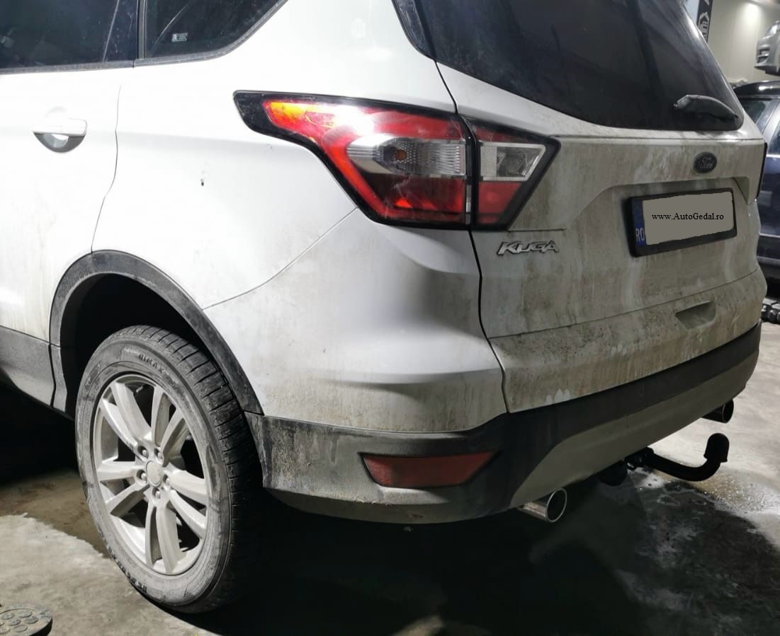 Carligul de remorcare semidemontabil cu 2 suruburi pentru “Ford Kuga Suv 2013-2019” este produs de firma Hakpol, companie cu sediul in Polonia, a carei activitate a inceput in anul 1991. In prezent, Hakpol produce peste 800 de modele de carlige de remorcare, pentru o gama variata de autoturisme. Fiecare produs este omologat si certificat la nivel European, omologarea fiind valabila inclusiv pe teritoriul Romaniei. Astfel, carligele de remorcare marca Hakpol prezinta omologare individuala si nu necesita certificare R.A.R. Tipul carligului de remorcare este semidemontabil, bila de remorcare fiind detasabila cu ajutorul a doua suruburi. Sarcina maxima de remorcare a acestuia este de 2100 kg , in timp ce sarcina verticala de apasare pe bila este de 105 kg . Carligul de remorcare semidemontabil pentru “Ford Kuga Suv 2013-2019” este dedicat masinii Dvs. si nu afecteaza garantia acesteia. Pentru montare, acesta este livrat impreuna cu accesoriile de prindere si schema tehnica, respectand indicatiile constructorului auto. Calitatea produsului este garantata de specificul procesului tehnologic de productie, printre avantaje regasindu-se vopsirea in camp electrostatic si automatizarea fluxului de productie cu ajutorul robotilor industriali. Garantia oferita pentru produsele marca Hakpol este valabila 5 ani. Pentru functionarea corecta a semnalelor luminoase atat pe masina cat si pe dispozitivul remorcat, este necesara montarea unei instalatii electrice speciale, prevazuta cu modul de protectie CAN-BUS, pe care o regasiti in rubrica “Accesorii suplimentare” . Dupa parcurgerea primilor 1000 km, este necesara verificarea si strangerea suruburilor, conform specificatiilor tehnice livrate odata cu produsul. De asemenea, se recomanda masurarea periodica a diametrului bilei de remorcare, pentru a va asigura ca acesta nu este mai mic de 49mm. Observatii generale: 1. Sarcina maxima de remorcare si sarcina verticala de apasare depind de greutatea totala a vehiculului si motorizare. Va rugam sa verificati Certificatul de Inmatriculare. 2. Daca bila de remorcare interfereaza cu numarul de inmatriculare al autovehiculului, aceasta va trebui demontata, urmand a fi utilizata doar atunci cand este cazul. 3. Daca bila de remorcare interfereaza cu senzorii de parcare, aceasta va trebui demontata, urmand a fi utilizata doar atunci cand este cazul.
