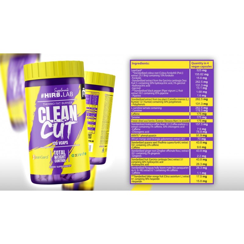 Clean Cut – 120 Capsule, Hiro Lab Datorită termogenezei, Clean Cut ajută la arderea naturală a grăsimilor. Conține formule brevetate LeanGard® și aXivite®, care oferă rezultate inovatoare și eficiente. Clean Cut stimulează energia și rezistența, permițând antrenamente mai eficiente. Accelerează rata metabolică. Îmbunătățește senzația de sațietate și ajută la controlul apetitului. Mai aproape de corpul visurilor tale Dacă dieta și planul tău de antrenament nu oferă rezultatele pe care le-ai căutat, merită să iei în considerare un arzător de grăsimi pentru a te ajuta să depășești platoul. Hiro.Lab oferă un produs inovator care te va ajuta să-ți atingi obiectivele de fitness. Clean Cut este aliatul tău în lupta împotriva lipsei de energie, a foamei și a aversiunii față de exerciții fizice. Datorită ingredientelor sale naturale, suplimentul termogenic Hiro.Lab, combinat cu antrenamentul, îți va accelera călătoria către corpul visurilor tale. Mai mult, produsul a fost testat pentru puritate - vezi studiul complet aici. Formule brevetate cu ingrediente active Clean Cut este o combinație inovatoare a două formule puternice: LeanGard și aXivite fenilcapsaicină. Prima este un amestec de extracte naturale care susține gestionarea greutății și reduce formarea de noi celule adipoase. AXivite, pe de altă parte, este cea mai pură formă de capsaicină, care accelerează rata metabolică și stimulează arderea grăsimilor. Datorită acestei combinații, acest arzător de grăsimi oferă un sprijin complet în lupta împotriva excesului de grăsime corporală și te va ajuta să obții fizicul visurilor tale. Nu pierde timpul cu produse care nu oferă rezultate satisfăcătoare - încearcă arzătorul de grăsimi inovator de la Hiro.Lab și simte diferența acum! Suport pentru termogeneză Termogeneza este procesul prin care corpul nostru produce căldură. Acest lucru ne ajută să menținem o temperatură constantă a corpului, indiferent de condițiile externe. În corpul nostru, termogeneza are loc în timpul digestiei, exercițiilor fizice și, de asemenea, prin reglarea temperaturii de către sistemul nervos. În timpul pierderii în greutate, stimularea termogenezei ne poate ajuta să ardem grăsimile și să accelerăm metabolismul. De aceea, arzătoarele de grăsimi precum acesta de la Hiro.Lab sunt atât de eficiente. Acestea accelerează metabolismul nostru, permițându-ne să ardem mai multe calorii în mai puțin timp. Acest lucru face ca atingerea fizicului visurilor tale să fie mai ușoară și mai eficientă. Investește acum în aspectul și sănătatea ta - alege un arzător de grăsimi de la Hiro.Lab! Scopul principal - Reducerea grăsimilor Clean Cut este un amestec de ingrediente al cărui scop principal este de a susține arderea grăsimilor. Pe lângă ingredientele active de bază, produsul conține L-carnitină, care facilitează arderea grăsimilor și îmbunătățește performanța organismului. Cafeina, de asemenea inclusă în formulă, crește nivelul de energie și accelerează termogeneza, ceea ce, la rândul său, poate accelera procesul de ardere a grăsimilor. Tirozina afectează metabolismul și reduce foamea, ajutându-te să-ți controlezi obiceiurile alimentare. Toate aceste ingrediente au fost special selectate pentru a accelera metabolismul, a reduce pofta de mâncare și a ajuta la arderea grăsimilor. Dacă ești în căutarea unei modalități eficiente de a pierde excesul de greutate, Clean Cut este alegerea perfectă. Prospect Clean Cut Ingrediente Porție: 3-4 capsule Porții per recipient: 40-30 Pachet: 120 capsule Ingrediente Clean Cut: LeanGard®* (extract standardizat de rădăcină de urzică (Coleus forskohlii (Poir.) 25:1 Briq) care conține 10% forskolină, extract standardizat de fructe de Garcinia cambogia Desr. 5: care conține 50% acid hidroxicitric, 5% garcinol, extract standardizat de fructe de piper negru (Piper nigrum L.) 50:1 care conține 95% piperină), agent de încărcare – celuloză microcristalină, extract standardizat de frunze de ceai chinezesc (Camellia sinensis (L.) 12:1 Kuntze) care conține 50% polifenoli, carnitină 68% (tartrat de L-carnitină), cafeină – cafeină anhidră, tirozină - L-tirozină, pudră de fructe de acai liofilizate (Euterpe Oleracea Mart.), Extract standardizat de boabe de cafea Arabica 20:1 (Coffea arabica L.) conținând 5% cafeină, 50% acid clorogenic, aXivite® fenilcapsaicină, extract de semințe de mango african (Irvingia gabonensis) 20:1, extract standardizat de semințe de guarana (Paullinia cupana Kunth.) 10:1 conținând 22% cafeină, extract standardizat de rădăcină de ghimbir (Zingiber officinale Rosc.) 20:1 conținând 5% gingerol, extract standardizat de fructe de Garcinia cambogia Desr. 5:1 conținând 60% acid hidroxicitric, agent antiaglomerant – dioxid de siliciu, extract standardizat de frunze de yerba mate (Ilex paraquariensis A. St.-Hil.) 6:1 conținând 4% cafeină, extract standardizat de fructe de portocală amară (Citrus aurantium L.) 4:1 conținând 90% hesperidină, agent de încărcare – hidroxipropilmetilceluloză. Poate conține lapte, soia, ouă și nuci. Supliment alimentar. Acest produs nu este destinat diagnosticării, tratamentului sau vindecării. Ingrediente per 4 capsule vegane LeanGard® 525 mg Extract standardizat de rădăcină de urzică (Coleus forskohlii (Poir.) 25:1 Briq) conținând 10% forskolină 155,82 mg – inclusiv forskolină 15,6 mg Extract standardizat de Garcinia cambogia Desr.fruit 5: conținând 50% acid hidroxicitric, 5% garcinol 262,5 mg – inclusiv acid hidroxicitric 131,3 mg – inclusiv garcinol 13,1 mg Extract standardizat de fructe de piper negru (Piper nigrum L.) 50:1 conținând 95% piperină 1,68 mg – inclusiv piperină 1,6 mg Extract standardizat de frunze de ceai chinezesc (Camellia sinensis (L.) 12:1 Kuntze) conținând 50% polifenoli 262,5 mg – 