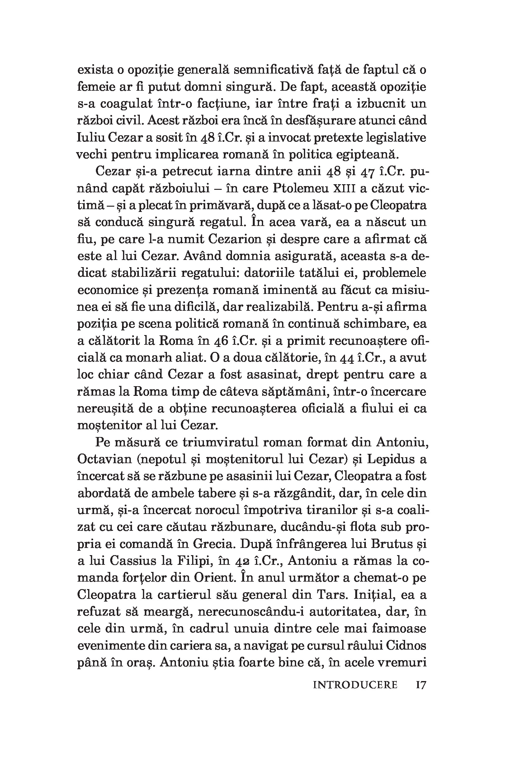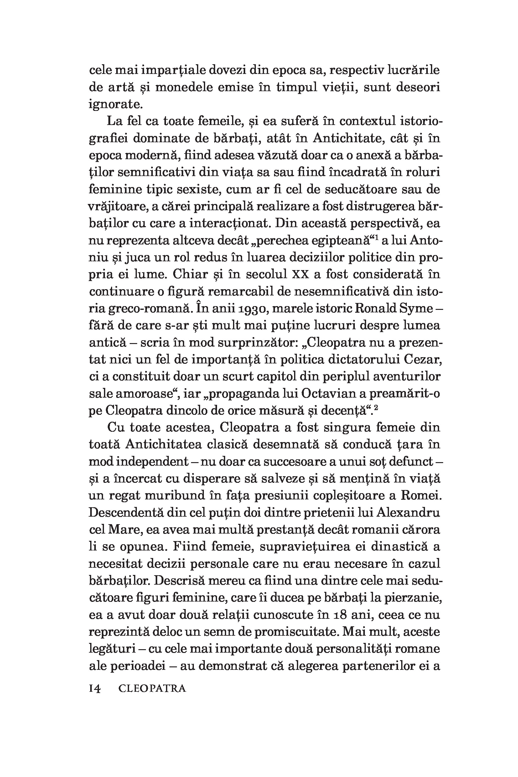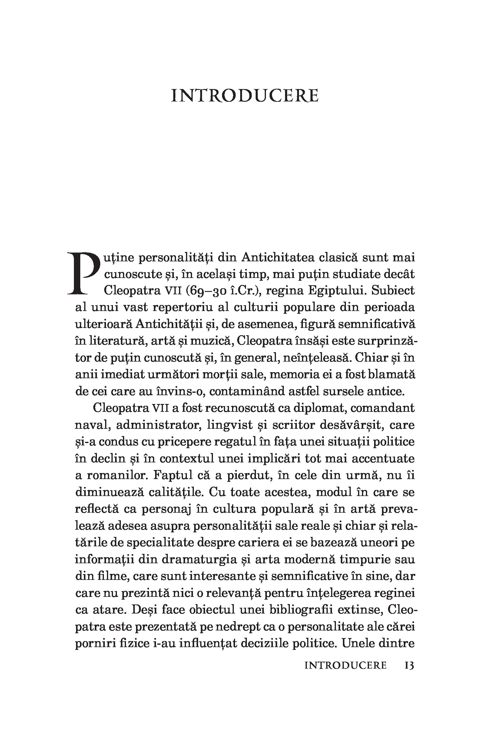 Celebritatea Cleopatrei se intemeiaza mai ales pe legendele exotice ale Renasterii, care au circulat pana in epoca moderna, dand nastere unor la fel de celebre reprezentari in pictura, teatru, film. Desi a fost una dintre cele mai puternice femei ale lumii antice, pana la noi a ajuns doar povara reputatiei sale postume – o figura artificiala a istoriei culturii.Istoricul si clasicistul Duane W. Roller scrie o biografie a Cleopatrei VII Thea Philopator bazata exclusiv pe sursele antice – romane, grecesti sau egiptene, inclusiv pe textele reginei care ni s-au pastrat – si pe marturiile arheologice, despartind personajul real de mit si redandu-i locul cuvenit in istorie. Cu atat mai limpede devine genealogia figurii legendare a Cleopatrei: astfel, de pilda, bine- cunoscutele episoade romantice legate de Cezar sau Marc Antoniu se lamuresc pe deplin ca investitii politice intr-un joc extrem de complicat.Dincolo de ascensiunea si caderea uneia dintre cele mai renumite femei ale istoriei, ni se asterne in fata ochilor o lume fascinanta, exotica, nebanuita astazi: Egiptul ultimilor Ptolemei.