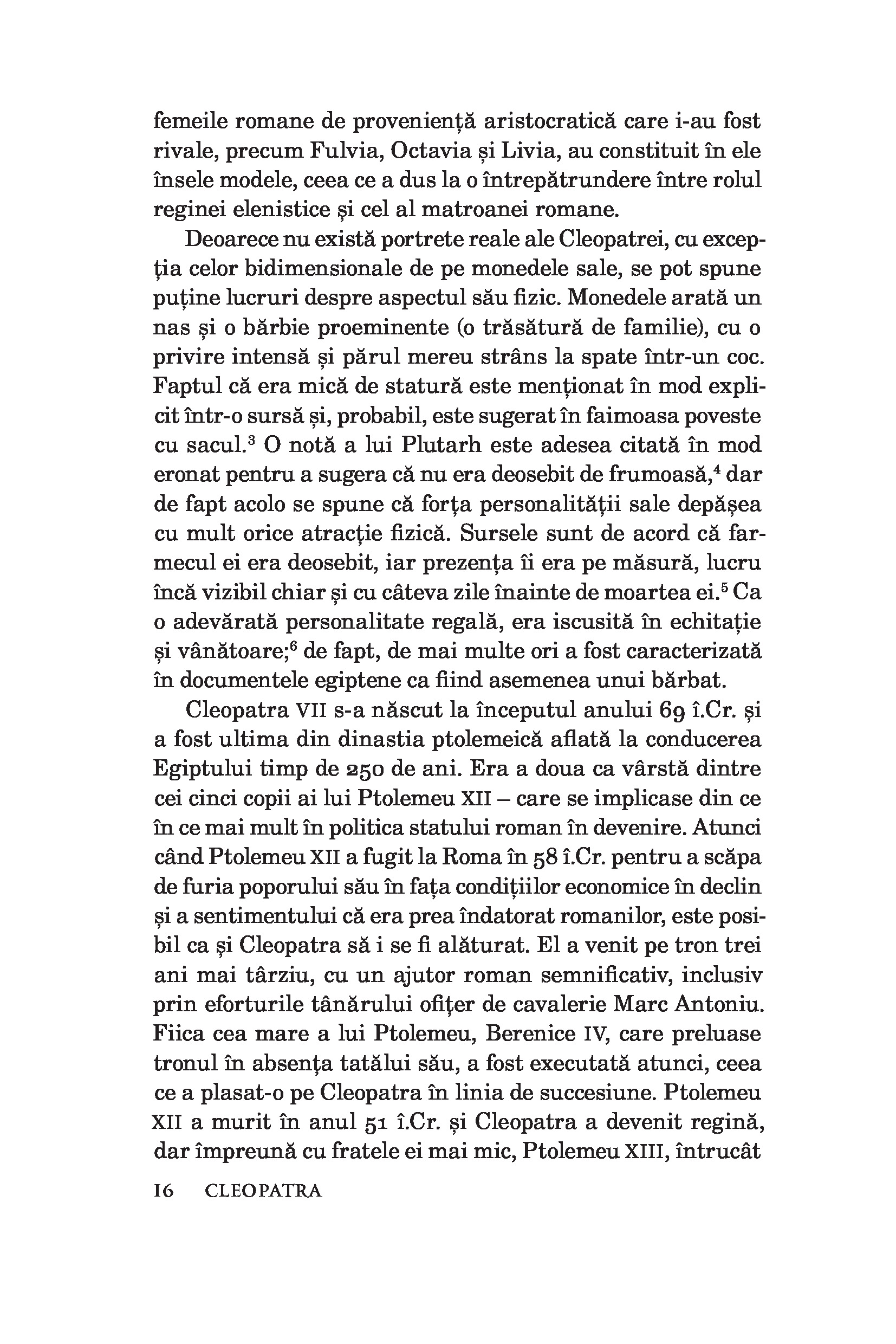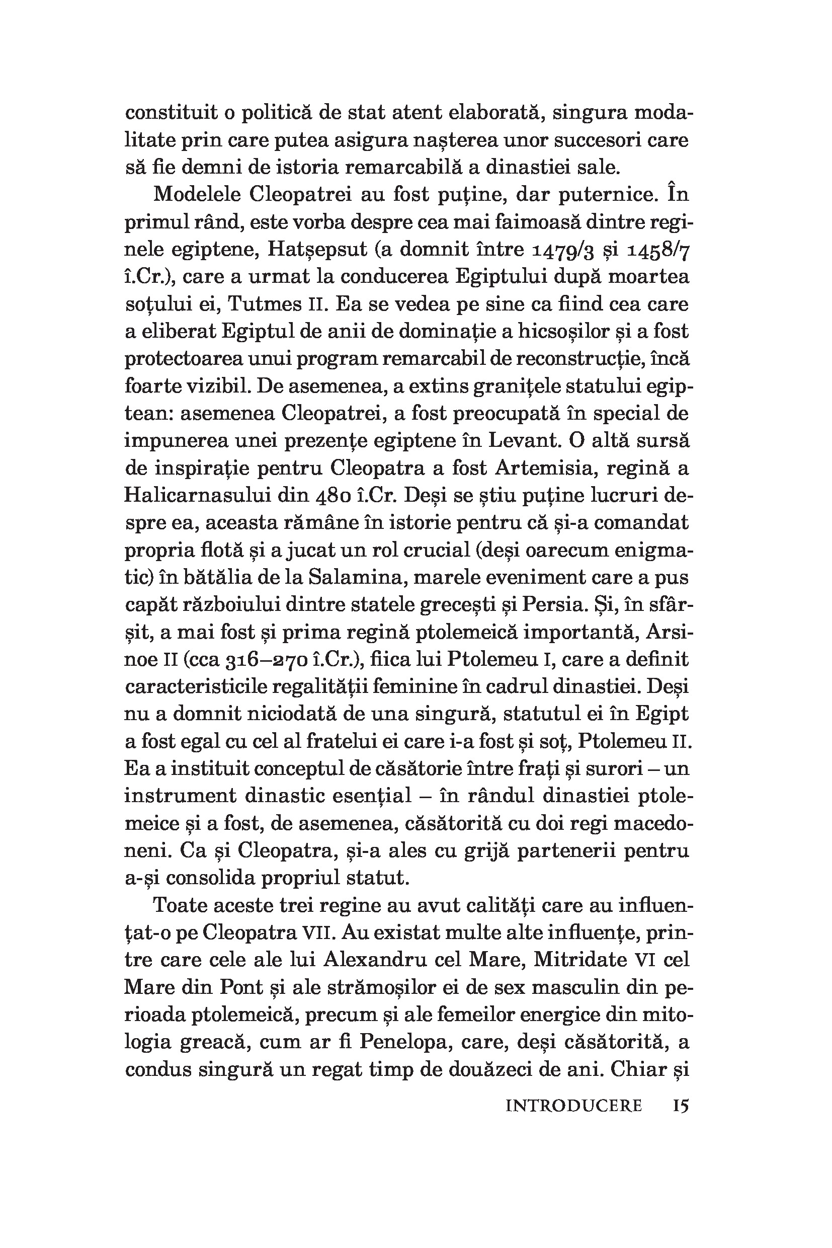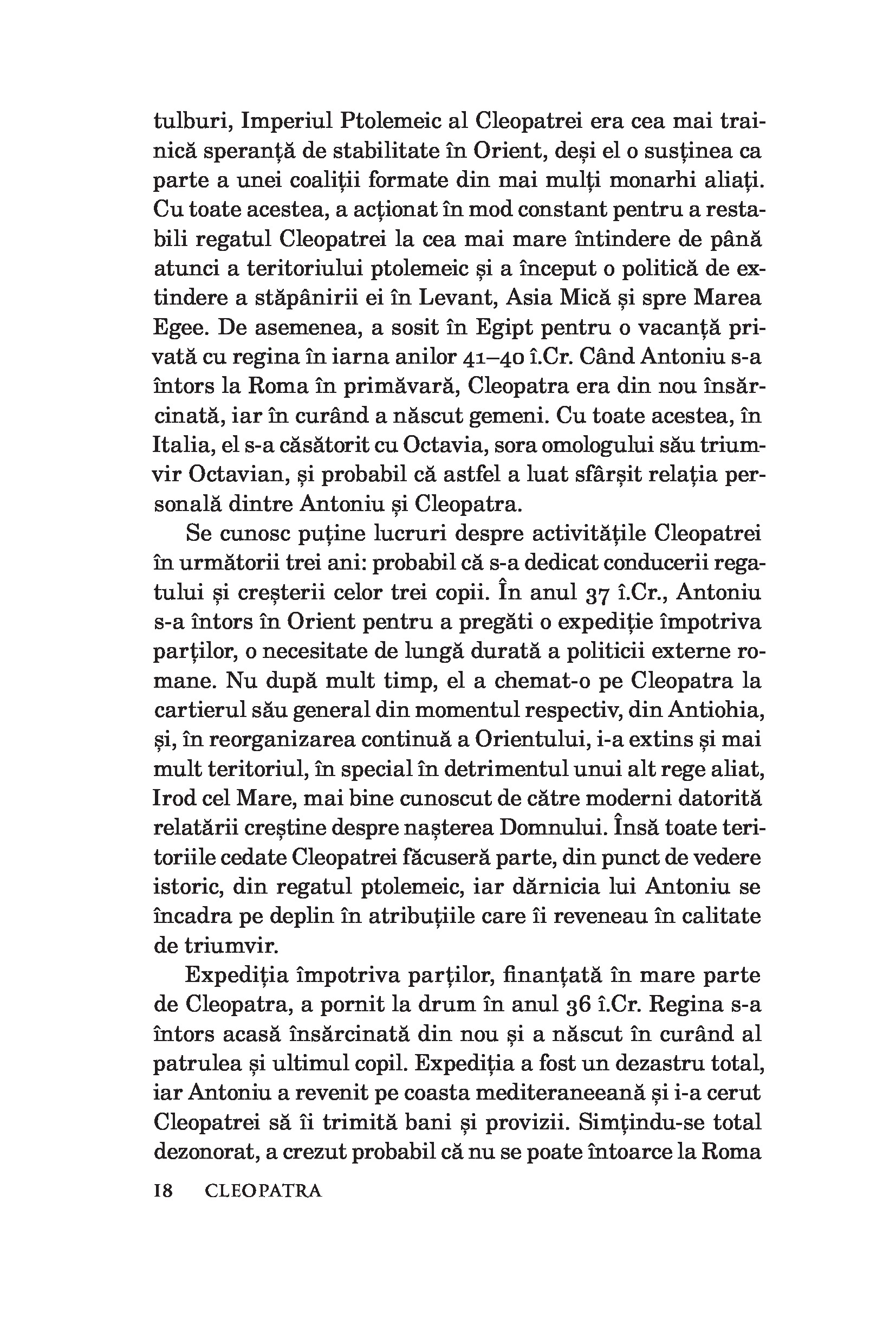 Celebritatea Cleopatrei se intemeiaza mai ales pe legendele exotice ale Renasterii, care au circulat pana in epoca moderna, dand nastere unor la fel de celebre reprezentari in pictura, teatru, film. Desi a fost una dintre cele mai puternice femei ale lumii antice, pana la noi a ajuns doar povara reputatiei sale postume – o figura artificiala a istoriei culturii.Istoricul si clasicistul Duane W. Roller scrie o biografie a Cleopatrei VII Thea Philopator bazata exclusiv pe sursele antice – romane, grecesti sau egiptene, inclusiv pe textele reginei care ni s-au pastrat – si pe marturiile arheologice, despartind personajul real de mit si redandu-i locul cuvenit in istorie. Cu atat mai limpede devine genealogia figurii legendare a Cleopatrei: astfel, de pilda, bine- cunoscutele episoade romantice legate de Cezar sau Marc Antoniu se lamuresc pe deplin ca investitii politice intr-un joc extrem de complicat.Dincolo de ascensiunea si caderea uneia dintre cele mai renumite femei ale istoriei, ni se asterne in fata ochilor o lume fascinanta, exotica, nebanuita astazi: Egiptul ultimilor Ptolemei.