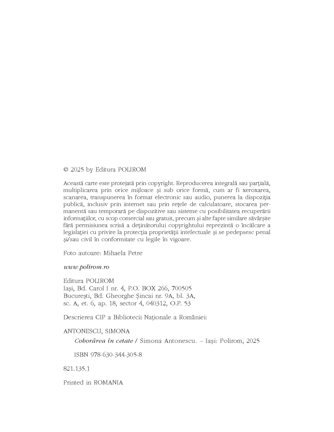 „Precum in Ultima cruciada, in care figura tutelara a lui Iancu de Hunedoara este retrasa in planul mitului, si in Coborarea in cetate se intampla la fel cu cea a lui Mihai Viteazul. Valahul e personajul mentinut, nu cu putin efort auctorial, in ipostaza contemplarii, lasand in prim-plan, ca personaje principale, junii din Scheii Brasovului.Nu este romanul lui Mihai Viteazul, precum cel anterior se aratase a fi al Chiajnei, ci romanul Brasovului, in care, mai mult ca niciodata, se remarca rafinamentul scriitural si documentarea ireprosabila, iar camera diegetica proiectata pe suma de personaje interpretand cumva o partitura a istoriei, altcumva o partitura a umanitatii si bunului-simt arata si cum se lasa ele strunite de bagheta auctoriala.Coborarea in cetate devine mai mult de atat: romanul Brasovului prin excelenta. Ramane doar ca Brasovul sa-si deschida portile primirii acasa a acestui roman, cum se vor deschide, cu siguranta, in mod simbolic si calauzitor, si celelalte pe care a intrat candva Mihai Viteazul.” (Adrian Lesenciuc)„In timp ce majoritatea prozatorilor romani contemporani prefera sa abordeze provocarile unui prezent adeseori mult prea familiar, Simona Antonescu resusciteaza aproape de una singura romanul istoric autohton. O carte este, printre altele, un refugiu din realitatea imediata, un mod de a trai in pielea altcuiva, poate intr-un alt loc, intr-un alt timp. 1600 se arata a fi un an bun de explorat. Dupa exceptionalele romane Hanul lui Manuc si Chiajna din Casa Musatinilor, Coborarea in cetate imi da inca un prilej sa sustin ca Simona Antonescu merita succesul unor celebre creatoare de fictiuni istorice, ca Philippa Gregory sau Tracy Chevalier.” (George Cornila)Simona ANTONESCU s-a nascut la Galati in 1969. A debutat in 2015 cu romanul Fotograful Curtii Regale, castigator al Concursului de Debut al Editurii Cartea Romaneasca/ Polirom si al Premiului de Debut al Uniunii Scriitorilor din Romania si finalist la Festival du Premier Roman de Chambery. A mai publicat romanele Darul lui Serafim (2016, 2020), Hanul lui Manuc (2017, 2018), Ultima cruciada (2019), distins cu Premiul Cartea Anului 2019 de Filiala Brasov a USR, In umbra ei (2021, 2024) si Chiajna din Casa Musatinilor (2023), care a obtinut numeroase premii, printre care Premiul National pentru Proza al Ziarului de Iasi in 2024, Premiul Radio Romania Cultural, categoria Proza, Premiul Cartea Anului 2024 acordat de Filiala Brasov a USR. In prezent, publica la Editura Polirom seria „Istoria povestita copiilor”, care a ajuns la al patrulea volum.