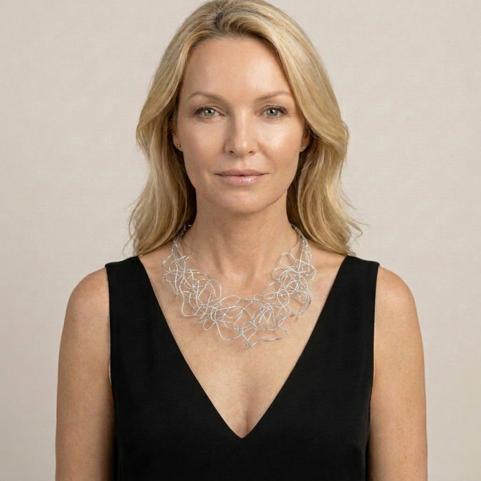 colier lung cu siruri formate din semicercuri prinse pe un fir metalic materiale: metal argintiu inchidere cu carabina si lant prelungitor Dimensiuni: lungimea colierului mai scurt: aprox. 24 cm lungime totală: aprox. 30 cm număr...