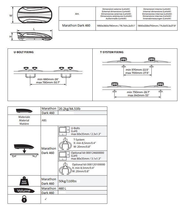 Cutie portbagaj auto Menabo Marathon 460 litri, negru mat Fie ca pleci la munte sau vei merge la mare problema bagajelor nu te mai pune la incercare. Acum este momentul sa folosesti cutia portbagaj Menabo Marathon Dark 460 pentru transportul bagajelor tale. Capacitatea de incarcare a cutiei Menabo iti permite sa economisesti timp si spatiu pentru calatoria planificata. Genti, trollere si orice alte lucruri de care ai nevoie, acestea vor incapea in Menabo Marathon. Acum nu mai este nevoie sa faci rabat de spatiu deoarece cutia Menabo Marathon este partenerul tau de drum. Specificatii tehnice cutie portbagaj Menabo Marathon 460 Dark Volum cutie 460 litri Capacitate maxima de incarcare 75 kg Material Plastic ABS Culoare Negru Mat Lungime exterioara 193.9 cm Latime exterioara 77.2 cm Inaltime exterioara 36.3 cm Sistem prindere Sistem U de 60 mm inclus Sistem T de 20 mm inclus Sistem U de 80 mm optional cu 000065000000 Antifurt Da Deschidere Pe o parte Greutate cutie 20.2 Kg Dimensiuni ambalaj 195x79x36 cm Compatibila cu bare Menabo Omega Otel Da Compatibila cu bare Menabo Omega Aluminiu Da Compatibila cu bare Menabo Tema Otel Da Compatibila cu bare Menabo Tema Aluminiu Da Compatibila cu Bare Menabo Delta Da Compatibila cu Bare Menabo Brio Da Compatibila cu Bare Menabo Sherman Da Compatibila cu Bare Menabo Raven Da Compatibila cu Bare Menabo Jackson Da Compatibila cu Bare Menabo Elefant Da Compatibila cu Bare Menabo Tiger Da Compatibila cu Bare Menabo Leopard Da Compatibila cu Bare Menabo Lince Da Compatibila cu Bare Menabo Ariete Da Compatibila cu Bare Menabo Professional Da Compatibila cu Bare K39 - K1 Aluminiu Da Compatibila cu Bare K39 - K1 Otel Da Compatibila cu Bare K39 Lion Da Compatibila cu Bare K39 King Da Compatibila cu Bare Thule Sqarebar Da Compatibila cu Bare Thule Wingbar Da Compatibila cu Bare Thule Probar Da Compatibila cu Bare Thule Slidebar Da Compatibila cu Bare Yakima ThruBar/FlushBar Da Compatibila cu Bare Mont Blanc Xplore Da Compatibila cu alte branduri Trimite o intrebare