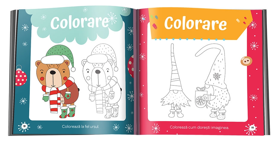 Stii ca de sarbatori totul e invaluit de farmec... Ei bine, cu ajutorul colectiei De Craciun, copilul tau chiar va spune ca e mai placut si interesant sa exerseze si sa rezolve activitati! Acestea sunt atent alese si insotite de personaje tematice si ii vor dezvolta creativitatea, dar si abilitati esentiale de invatare. In De Craciun, colorez si desenez, va putea:sa-si foloseasca creioanele, cariocile preferate ca sa coloreze;sa uneasca puncte;sa deseneze.Nu uita sa-i spui ca la sfarsitul cartii poate sa-si completeze propria lista cu dorinte de Craciun!