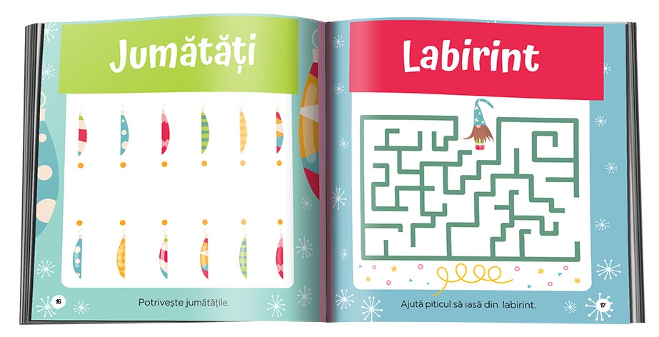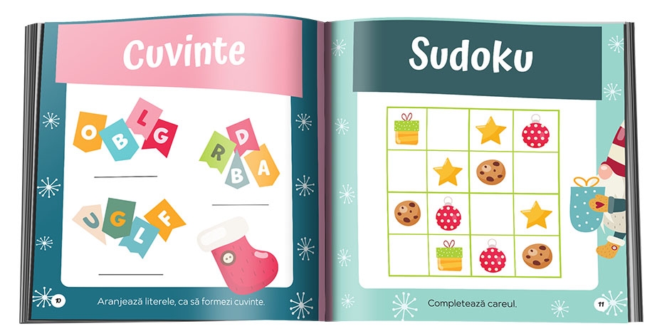 Stii ca de sarbatori totul e invaluit de farmec... Ei bine, cu ajutorul colectiei De Craciun, copilul tau chiar va spune ca e mai placut si interesant sa exerseze si sa rezolve activitati! Acestea sunt atent alese si insotite de personaje tematice si ii vor dezvolta creativitatea, dar si abilitati esentiale de invatare.In De Craciun, imi dezvolt logica, va putea:sa potriveasca jumatati de obiecte;sa rezolve labirinturi;sa dezlege cuvinte si sa rezolve tabele logice si sudoku.Nu uita sa-i spui ca la sfartitul cartii poate sa-si completeze propria lista cu dorinte de Craciun!