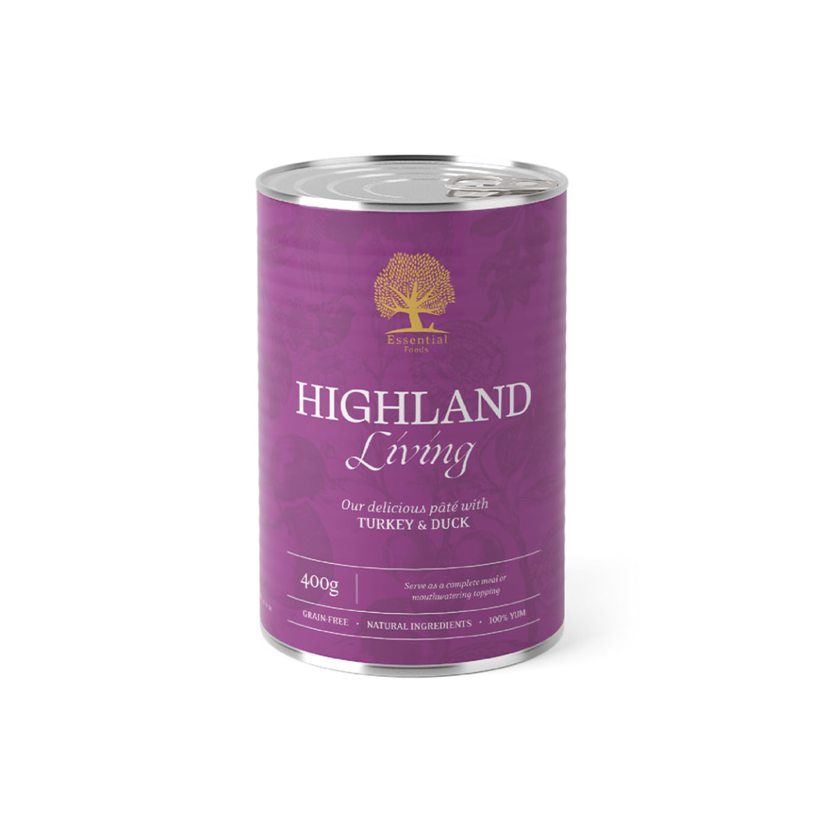 ESSENTIAL Highland Living, XS-XL, Curcan și Rață, conservă hrană umedă fără cereale câini, (pate), 400g
