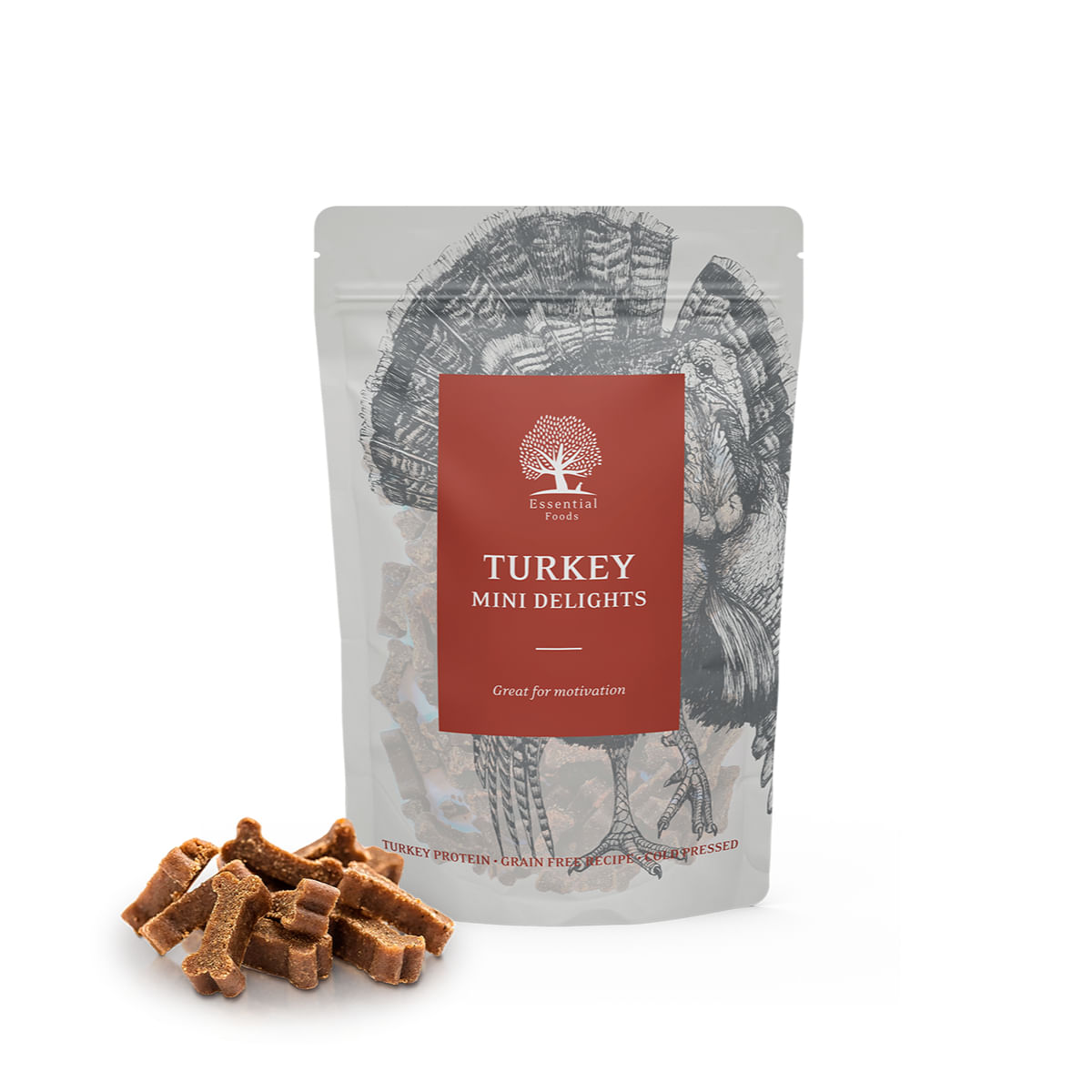 ESSENTIAL Mini Delights, XS-S, Curcan, punguță recompense fără cereale câini, 100g