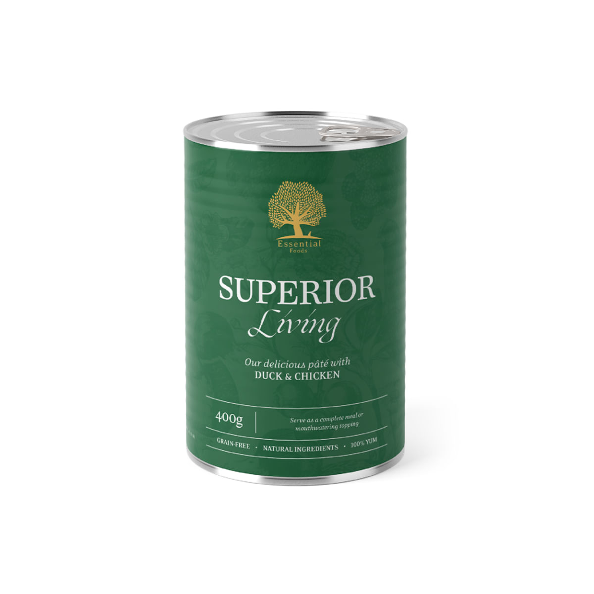 ESSENTIAL Superior Living, XS-XL, Rață și Pui, conservă hrană umedă fără cereale câini, (pate), 400g