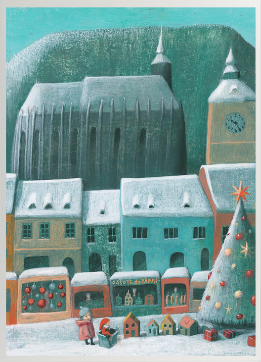 Felicitare Case mari si mici ilustrata de Irina Dobrescu.Seria de felicitari ale Irinei Dobrescu are la baza ilustratii de carti in marea majoritate.Acestea pot constitui imagini de sine statatoare, pastrand o atmosfera de basm, evocand bucuria copilariei si stabilind o legatura emotionanta cu privitorul.Irina Dobrescu este ilustratoare, autoare si membra fondatoare a Clubului Ilustratorilor.Printre cartile ilustrate se numara “Invizibilii“ de Ioana Parvulescu, “Gradinile pamantesti ale printesei de Marti” de Veronica Niculescu “Ziua in care a fugit Somnul” de Victoria Patrascu, “Regele Piticut” de Radu Vancu, iar dintre editurile cu care a colaborat: Arthur, Cartier, Humanitas, Vellant, Nord Sued Verlag, Baroque Books and Arts.Printre premii si distinctii se pot mentiona Trofeul Arthur pentru “Lupul jucator de poker” ( text si ilustratii), doua nominalizari Astrid Lingren, doua distinctii White Raven si premiul Carturino pentru cea mai frumoasa carte in 2024.Tehnicile folosite sunt variate: acuarela, colajul, pictura in guasa pe ceramica la rece, acrilice pe panza, creioanele colorate fiind folosite alternativ pentru a crea lumi de poveste, ce arata dragostea ei pentru literatura, mituri, vremuri apuse, dar si pentru realitatea cotidiana in care vede reflectate toate acestea.