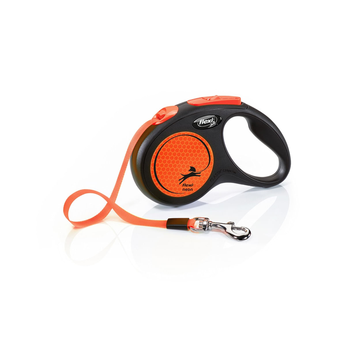 FLEXI Neon, lesă bandă retractabilă câini, reflectorizant, nylon, portocaliu, S(15kg, 5m)