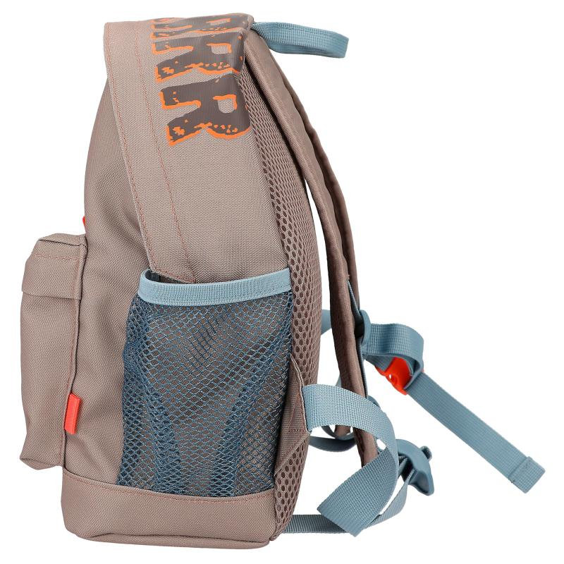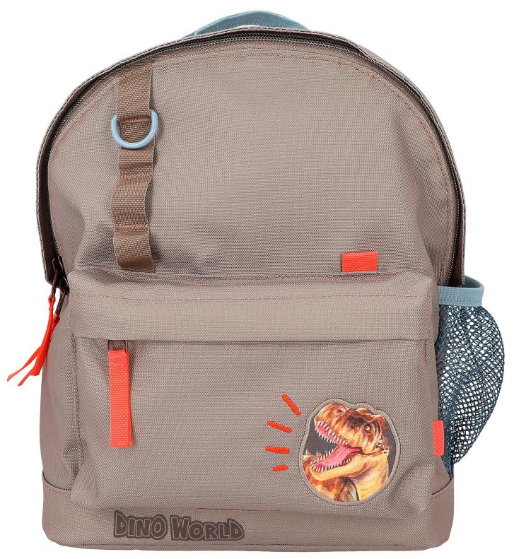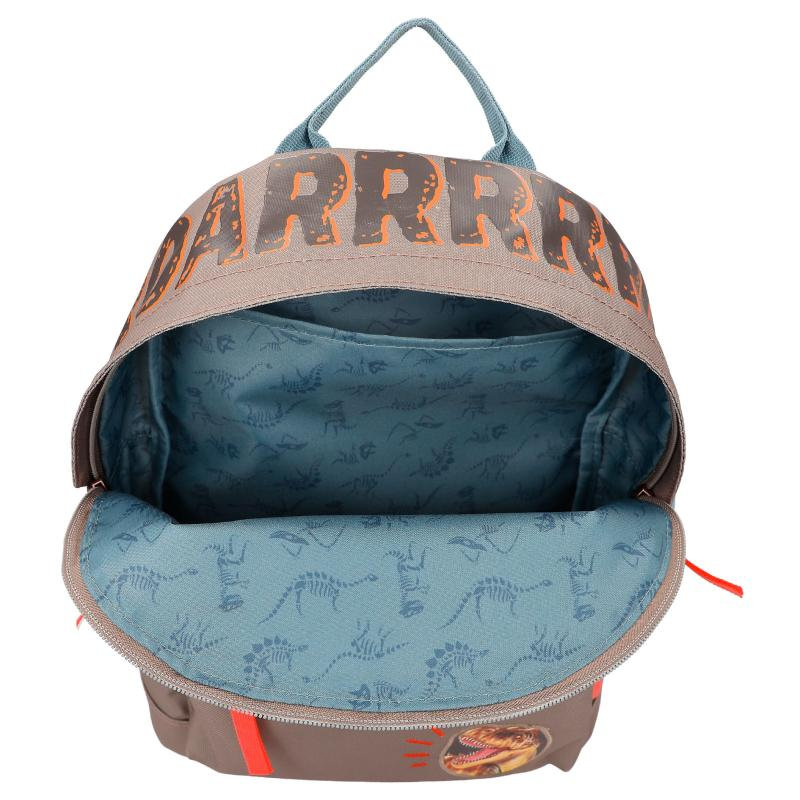 Ghiozdanul de la Dino World maro are detalii in culori grozave de albastru deschis si portocaliu, precum buzunarul lateral din plasa, manerele cu fermoar si imprimeu mare „Roarrr” deasupra si broderie T-rex pe buzunarul din fata. Spatele ghiozdanului este captusit, la fel ca si curelele de umar, care pot fi reglate in lungime. Material: 100% poliester