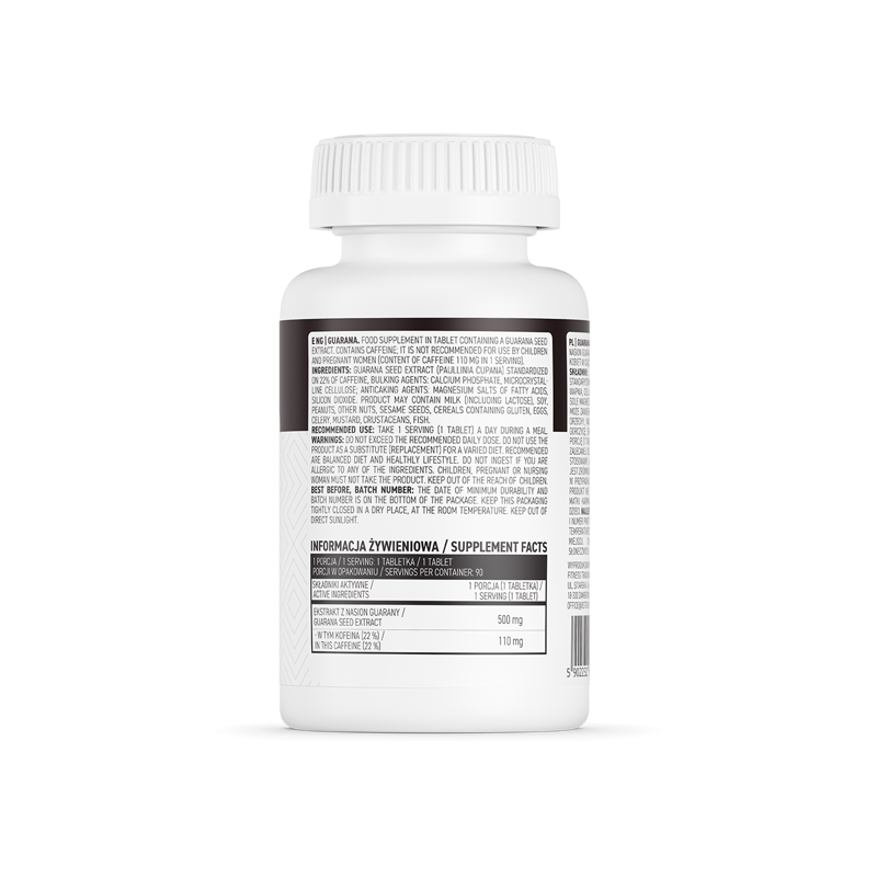 Beneficii Guarana: - este un aliat perfect in cure de slabire; - lupta impotriva excesului de greutate; - are proprietati de relaxare, ofera energie; - benefic impotriva oboselii. OstroVit Guarana este un supliment natural care conține un extract puternic de stimulare de semințe de guarană (Paullinia Cupana). Este una dintre cele mai bogate surse de cofeină. Are un efect mobilizator foarte puternic asupra organismului, stimulează sistemul nervos, susține creierul, îmbunătățește memoria și concentrarea, reduce oboseala și adaugă vitalitate. OstroVit GUARANA este recomandat în timpul efortului fizic și psihic crescut, în perioadele de deteriorare a stării de bine, de convalescență și de scădere a activității. Cantitatea mare de cofeină conținută în preparat are un efect termogen puternic, care stimulează metabolismul și ajută la accelerarea arderii țesutului adipos excesiv. În plus, guarana contribuie la inhibarea apetitului, care susține în continuare procesul de slăbire. În plus, extractul de guarana îmbunătățește eficacitatea și eficiența antrenamentului, stimulează organismul la efort fizic. Funcționează anti-catabolic, ceea ce reduce descompunerea țesutului muscular și accelerează după antrenarea regenerării musculare. Efectul stimulant al preparatului este benefic și pentru viața intimă. Ajută la îmbunătățirea stării de fitness și a performanțelor sexuale, susține erecțiile, prelungește timpul actului sexual. Proprietățile OstroVit Guaranan Adaugă vitalitaten Ajută la reducerea senzației de oboseală fizică și psihicăn Susține activitatea creieruluin Ajută la îmbunătățirea memoriei și a concentrăriin Ajută la îmbunătățirea eficienței și intensității exercițiilorn Ajută la îmbunătățirea stării de fitness și a performanțelor sexuale. Guarana este un supliment foarte bun si cunoscut pentru capacitatea de a pierde in greutate, datorita actiunii sale asupra depozitelor de grasime. Guarana este un arbust, o planta cataratoare din familia Sapindaceae, fiind originara din Amazon. Planta este cunoscuta pentru proprietatile sale puternice de slabire si anti-oboseala. Acest lucru se datoreaza continutului bogat de cofeina ce se gaseste in mod natural in semintele fructelor de guarana. Suplimentul noastru Guarana Forté este formulat dintr-un ingredient activ cu doză mare pentru a oferi o doză optimă în doar 2 capsule. Guarana își datorează reputația semințelor sale deosebit de bogate în cafeină. Într-adevăr, găsite în fructe, semințele de guarana sunt o sursă naturală de cofeină, o substanță activă pentru slăbire. Virtuțile guaranei sunt numeroase, permițând, în special, să asocieze proprietățile de slăbire și energizare. Această dublă acțiune este ideală pentru a limita reducerile de energie adesea asociate cu perioadele de dietă. Doza de cofeină de 25% asigură 100 mg de cafeină în doar 2 capsule pe zi. Acesta din urmă este recunoscut ca promovând termogeneza, ceea ce îl face un arzător de grăsime excepțional! Astfel, în ameliorarea unei perioade de o lună de regenerare, suplimentul nostru alimentar Guarana Forté, puternic dozat în cofeină, vă va permite să beneficiați de virtuți, slăbire și anti-oboseală! Prospect Guarana: Mod administrare: 1 tableta pe zi cu un pahar cu apa. A nu se administra dupa ora 18:00, poate provoca insomnie. Contraindicații Conține cafeină, care nu este recomandată copiilor și femeilor însărcinate Extract de semințe de Guarana (Paullinia cupana) standardizat la 22% cofeină, substanțe de umplere: fosfat de calciu, celuloză microcristalină, agenți anti-caking: săruri de magneziu ale acizilor grași, dioxid de siliciu. Produsul poate conține lapte (inclusiv lactoză), soia, grâu, ouă, țelină, muștar, crustacee. Contine cofeina; nu este recomandat copiilor și femeilor însărcinate (conținut de cofeină 110 mg într-o porție); Nu consumați cu alte produse care sunt o sursă de cofeină sau alte ingrediente cu efecte similare. Compozitie Ingrediente 1 tableta Extract de guarana din seminte cu 22% cafeina (Paullinia cupana) 500 mg *Cafeina 1100 mg Garantat fără OMG și fără gluten ATENTIE: Nu luati acest produs daca sunteti insarcinata sau alaptati. A nu se lasa la indemana copiilor. Nu utilizati daca sigiliul este rupt. A se pastra intr-un loc racoros si uscat. Nu folositi un supliment alimentar ca inlocuitor al unei alimentatii variate si echilibrate! Acest supliment alimentar nu este destinat sa diagnosticheze, sa trateze, sa vindece sau sa previna vreo boala.