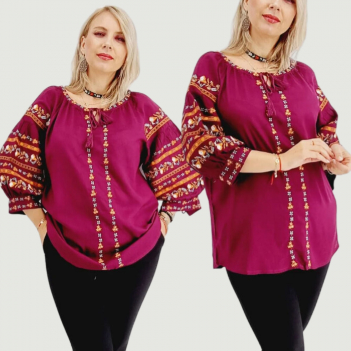 Ie traditionala romaneasca pentru femei, cu motive florale. Broderie mov si verde, brodata la razboi pe panza de bumbac de culoare alba.