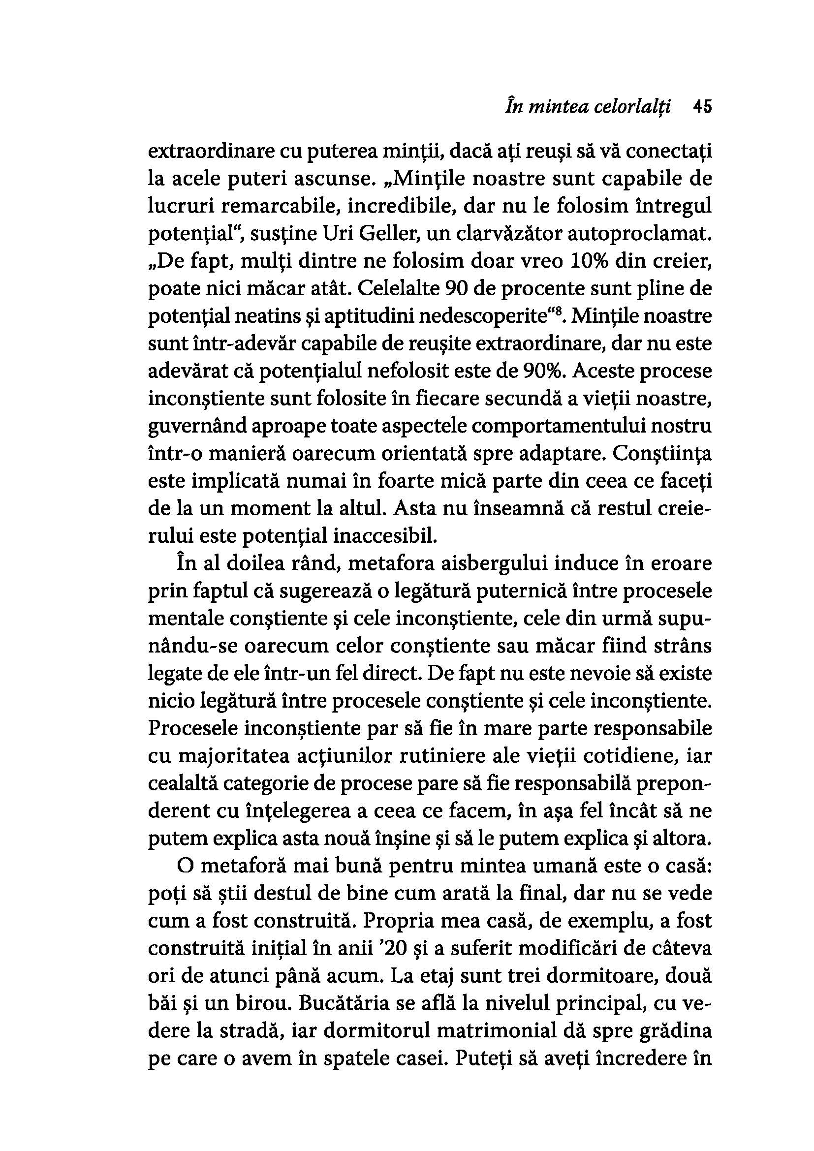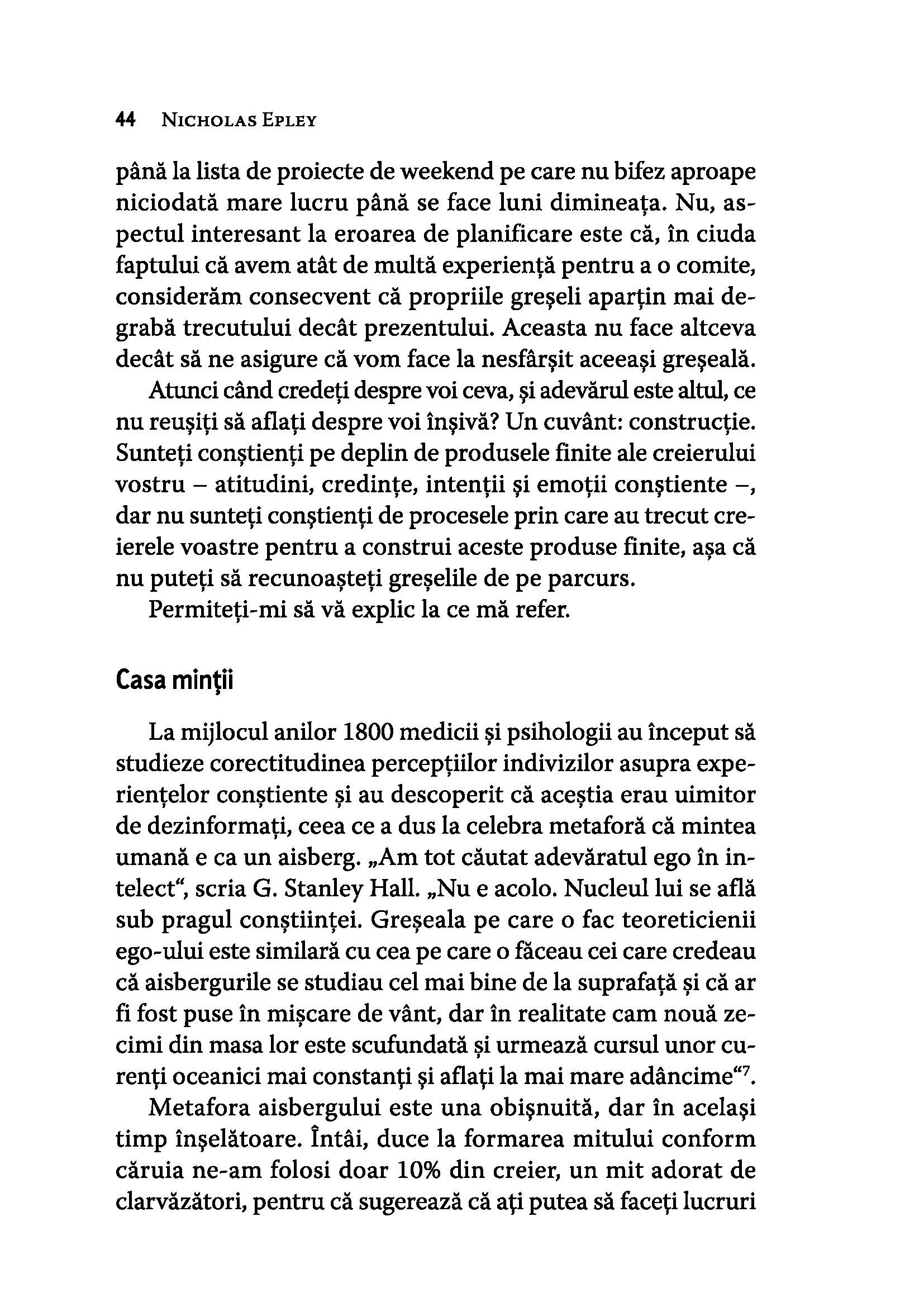 Castigator al Premiului Book Prize for the Promotion of Social and Personality Science (Society for Personality and Social Psychology) 2015 In cartea „In mintea celolrlati”, Nicholas Epley se apleaca asupra abilitatii noastre de a citi mintea celorlalti, argumentand ca noi credem ca suntem mai abili in a citi gandurile si intentiile celorlalti decat sunt de fapt capabili. Epley ne arata care sunt greselile pe care le facem cand incercam sa ne dam seama ce simt si vor cei din jur, dar ofera si o alta perspectiva despre cum sa intelegem atat propriile stereotipuri cat si pe ale celorlalti. Cine trebuie sa citeasca aceasta carte? Oricine vrea sa inteleaga dorintele celor din jurOricine este curios de greselile frecvente pe care le facem incercand sa ghicim ce simt ceilaltiOricine interesat de cum functioneaza propria minte Recenzii: ,,Una dintre cele mai inteligente si spectaculoase carti pe care le-am citit in ultimii ani. Din cele cateva zeci de carti serioase despre stiintele sociale dintre care poti alege, capodopera lui Epley este creme de la creme.” - Steven D. Levitt, autorul cartii Freakonomics ,,In mintea celorlalti este o minunata explorare a misterelor mintii umane, precum si motivele pentru care esuam in rezolvarea acestora. Una dintre cele mai bune carti ale ultimelor decade.” - Daniel Gilbert, autorul cartii Stumbling on Happiness ,,Cum este sa fii in pielea altcuiva? Cum reusim sa aflam ce se afla in mintea celorlalti? Psihologul Nicholas Epley ne ofera un fascinant tur a celor mai recente descoperiri stiintifice despre modul in care reusim, desi in multe cazuri esuam, sa ne dam seama la ce se gandesc ceilalti.”- Steven Pinker, autorul cartii How the Mind Works Despre autor: Nicholas Epley este Profesor John Templeton Keller si preda stiinte comportamentale la Scoala de afaceri din cadrul Universitatii Chicago. Acesta si-a luat doctoratul in psihologie la Universitatea Cornell, in 2001, si a fost asistent universitar in cadrul Departamentului de psihologie al Universitatii Harvard pana in 2005. Cercetarile sale au stat la baza a mai mult de 50 de articole stiintifice aparute in peste 20 de publicatii si au fost finantate constant de Fundatia nationala pentru stiinta si de Fundatia John Templeton. A scris pentru New York Times si Chicago Tribune, fiind numit un „profesor de urmarit” de catre Financial Times, si este castigatorul Premiului pentru inovatie teoretica acordat in 2008 de Societatea pentru psihologia sociala si a personalitatii. In 2011, Asociatia Americana de Psihologie i-a acordat Distinsul Premiu Stiintific pentru Contributii aduse Psihologiei.