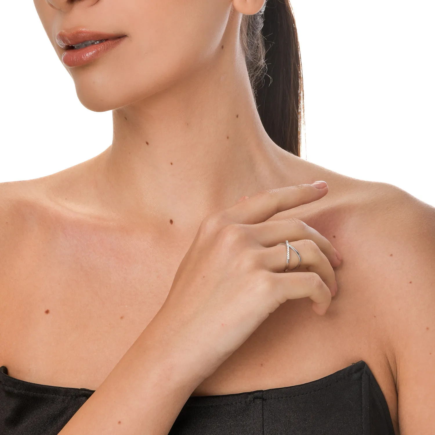Designul geometric al acestui inel din aur alb cu zirconii transmite un aer modern si cool, potrivit pentru cei care iubesc accesoriile cu personalitate. Liniile sale incrucisate creeaza un efect vizual unic, iar zirconiile adauga un plus de luminozitate discreta. Poarta-l singur pentru un look minimalist sau combina-l cu alte inele pentru un mix statement. Redefineste-ti stilul alaturi de DAAR si lasa bijuteriile sa vorbeasca pentru tine.