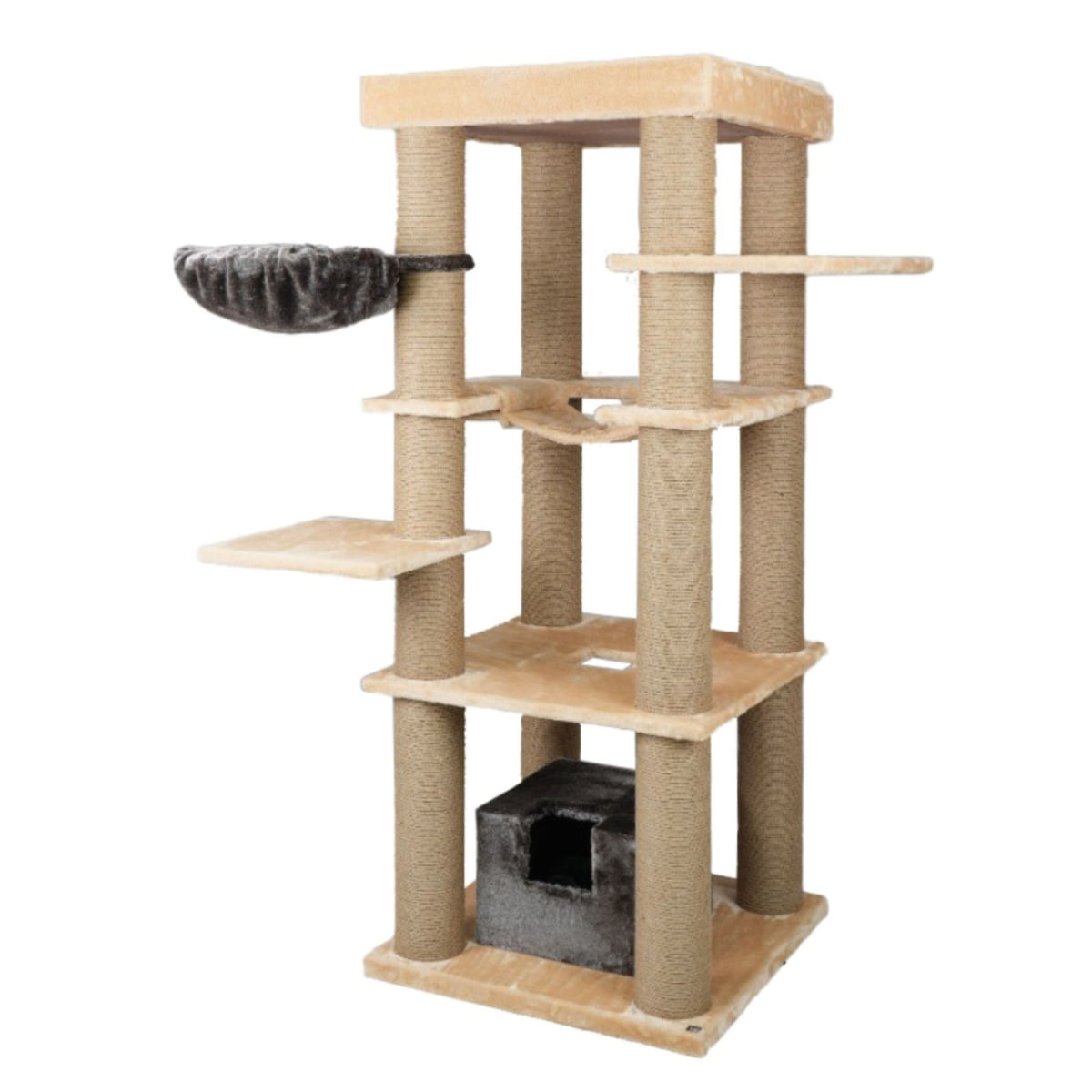 SHAW Madrid, ansamblu de joacă pisici, 4 etaje, 1 căsuța, MDF și pluș, elemente de zgâriat, elemente hamac, bej, 105x105x200cm