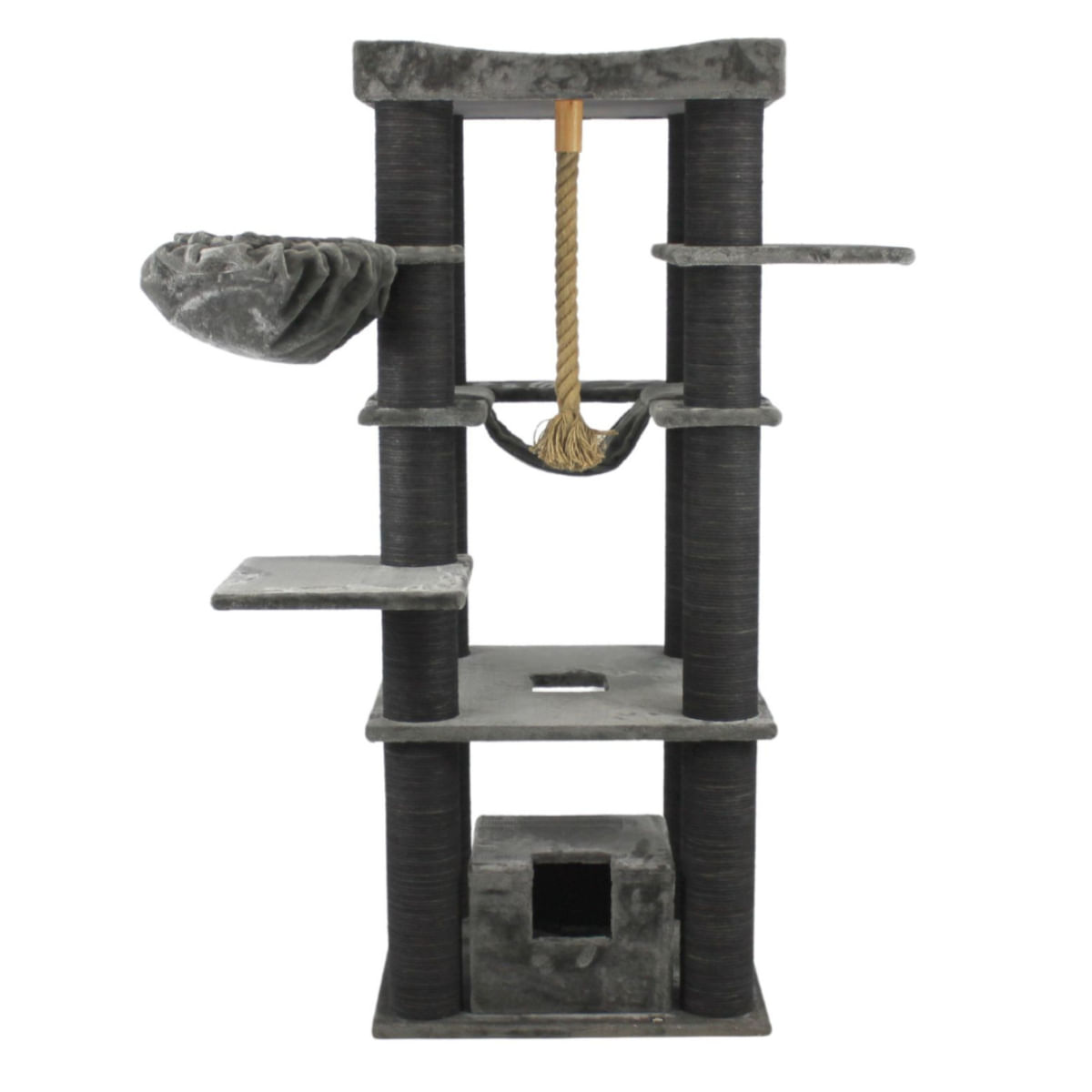 SHAW Lizbon, ansamblu de joacă pisici, 5 etaje, 1 căsuța, MDF și pluș, elemente de zgâriat, elemente hamac, gri, 85x140x203cm