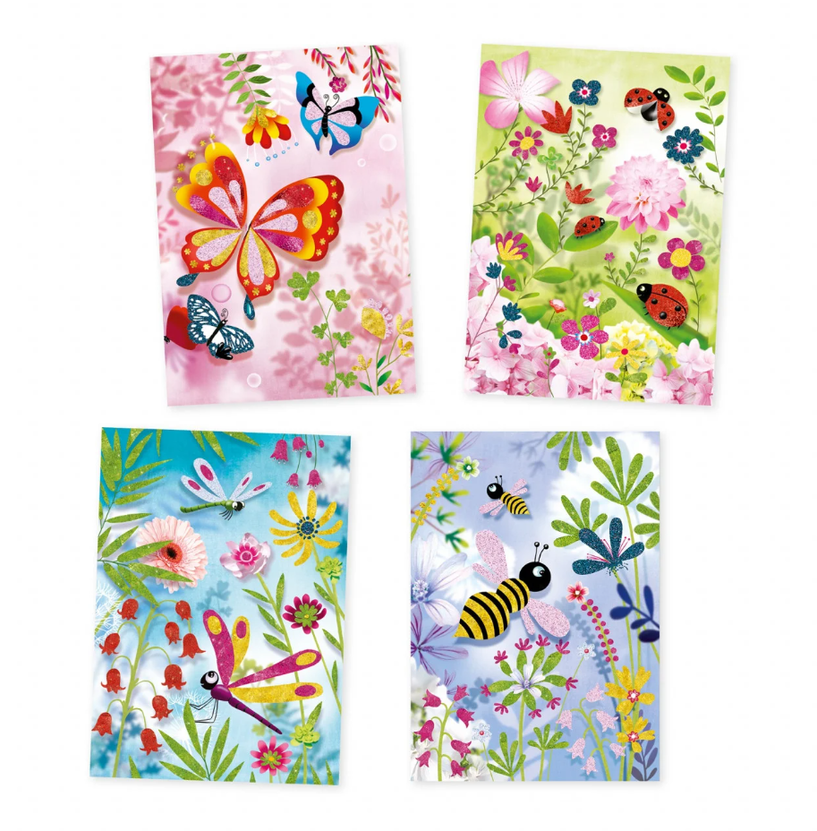 4 planse cu flori si insecte de gradina, pentru a fi inveselite cu sclipici colorat.Copiii plaseaza plansa in cutie, folosesc instrumentul furnizat pentru a expune zonele pre-lipite si presara sclipici urmand instructiunile codificate pe culori.Odata finalizat, vor fi incantati de stralucirea insectelor!Se lucreaza in cutie pentru a evita imprastierea sclipiciului.Instrument inteligent creat de Djeco pentru expunerea zonelor pre-lipite.Tuburi cu sclipici tip eprubeta pentru imprastierea precisa a sclipiciului.Perie pentru a indeparta excesul de sclipici.Cutie de depozitare cu inchidere elastica pentru pastrarea continutului.Jocul contine: 4 planse de decorat (15 x 21 cm), un instrument de lucru (pentru dezlipit folia autocolanta), o pensula pentru a indeparta surplusul, 6 tuburi cu sclipici, manual cu instructiuni prin imagini, pas cu pas.