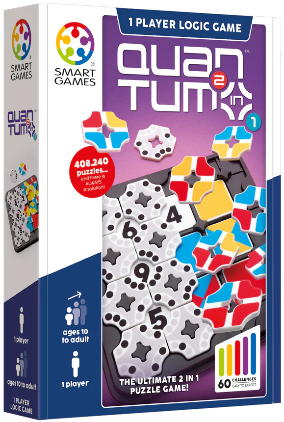 Quantum – 2 in 1 Puzzle este jocul de logica suprem, cu doua moduri de joc intr-unul singur! Cu 60 de provocari de dificultati progresive, Quantum stimuleaza concentrarea, gandirea spatiala, planificarea si rezolvarea de probleme intr-un mod distractiv.Stapaneste aranjarea corecta a culorilor pe o fata, apoi rezolva provocari captivante pe cealalta, unde trebuie sa potrivesti punctele astfel incat sa corespunda numerelor. Iar daca nu este suficient, poti crea mii de puzzle-uri proprii – fiecare avand o solutie garantata!Contine: 1 tabla de joc, 9 placi de provocare duble, 16 piese de puzzle duble, 1 brosura cu 60 de provocari si solutii, 1 regulament.Smart Games este lider mondial in producerea jocurilor de logica de peste 30 de ani. Creeaza jocuri logice, unice si inovative, cu tematici pe placul copiilor dar care se potrivesc pentru toate varstele.Principalele caracteristici ale jocurilor Smart Games includ:Diversitate: ofera o gama variata de jocuri si puzzle-uri pentru toate varstele si nivelurile de abilitate. Acestea includ jocuri de logica, jocuri de strategie, puzzle-uri tridimensionale cu miniaturi pe placul copiilor.Stimularea gandirii logice: sunt proiectate pentru a incuraja gandirea strategica, analitica si critica. Ele pun la incercare abilitatile jucatorilor in rezolvarea de probleme si in identificarea unor solutii eficiente.Adaptabilitate: Multe dintre jocuri sunt concepute pentru a fi portabile si compacte, ceea ce le face potrivite pentru a fi jucate in timpul calatoriilor sau in orice alta ocazie. Ele sunt, de asemenea, adaptate pentru a fi jucate atat de copii, cat si de adulti.Reutilizabilitate: Majoritatea jocurilor Smart Games sunt realizate din materiale durabile si pot fi rejucate de mai multe ori. Ele ofera mereu noi provocari si posibilitati de invatare, facandu-le potrivite pentru utilizare pe termen lung.
