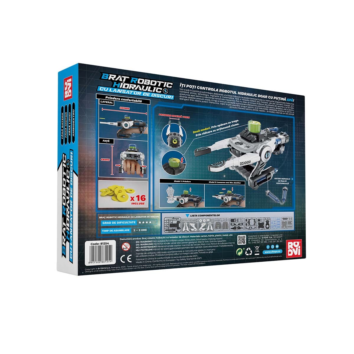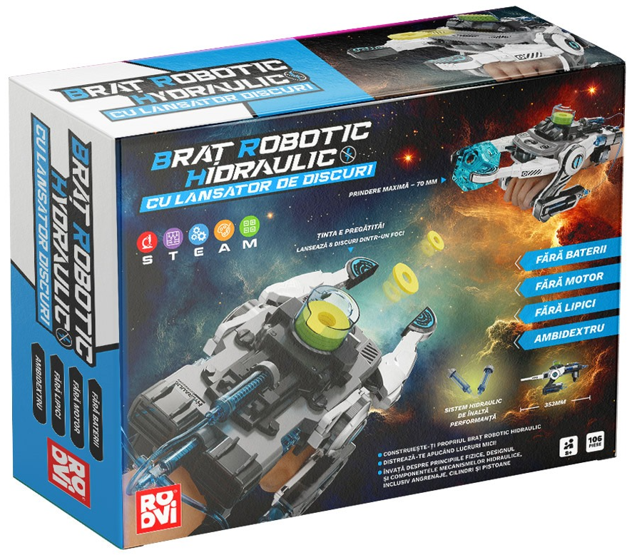 Jucarie interactiva - Brat robotic hidraulic cu lansator de discuriIntra in lumea fascinanta a mecanicii fluidelor si a tehnologiei controland Bratul Robotic Hidraulic cu lansator de discuri!Descopera o modalitate interactiva de a invata principii si concepte stiintifice prin joaca si experiment. Construit pe baza principiilor hidraulicii, acest brat poate ridica, prinde si muta obiecte doar prin puterea apei si a presiunii, fara a utiliza baterii, motor sau lipici.In plus, Bratul hidraulic are integrat un lansator de discuri care face ca jocul sa fie atat educativ, cat si interactiv, stimuland totodata creativitatea si setea de aventura a copiilor. Cu ajutorul acestuia se pot lansa 8 discuri zburatoare dintr-un singur foc, transformand astfel jocul intr-o aventura spectaculoasa.Dezvoltarea cunostintelor stiintifice ale copiilor se poate realiza acum mult mai usor cu ajutorul acestui Brat Robotic Hidraulic cu lansator de discuri. Setul este alcatuit din componente sigure si fiabile, ce prezinta rezistenta si siguranta la utilizarea pe termen lung, astfel incat experienta de joaca si invatare este cu adevarat memorabila.In plus, Bratul Robotic Hidraulic cu lansator de discuri antreneaza atat atentia si indemanarea, cat si imaginatia fara limite a copiilor, care pornesc in aventuri fascinante si exploreaza cu propria minte posibilitati stiintifice nebanuite.De ce sa alegi Bratul Robotic HidraulicEste un joc interesant si educativ care ii fascineaza pe micii ingineri pasionati de stiinta si tehnologie, fiind potrivit atat pentru dreptaci, cat si pentru stangaci.Le ofera copiilor oportunitatea de a invata cum functioneaza hidraulica, intelegand concepte de baza din fizica si inginerie.Asamblarea si controlul bratului necesita rabdare si indemanare, ceea ce favorizeaza exersarea coordonarii abilitatilor motorii fine si a atentiei la detalii.Sistemul de prindere este facil, asigurand manevrarea si fixarea obiectelor cu usurinta.Functia de lansare a celor 8 discuri zburatoare asigura doza maxima de distractie si aventura.Functioneaza exclusiv pe baza de apa si presiune, fiind o solutie prietenoasa si sigura atat pentru copii, cat si pentru mediul inconjurator.Este prilejul perfect pentru a te conecta cu copilul tau prin joaca, experimente inedite si distractie autentica.Daca iti doresti o experienta educativa completa care sa trezeasca sau sa amplifice pasiunea pentru stiinta si tehnologie a copilului tau, Bratul Robotic Hidraulic cu lansator de discuri este alegerea perfecta.Setul include 16 discuri zburatoare.Varsta potrivita: 8+Nerecomandat copiilor mai mici de 3 ani.