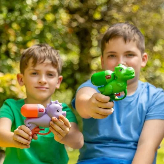 Mainile sus! Unul dintre cele mai distractive jocuri din zilele calduroase de vara este tragerea cu un pistol cu apa.Maner si tragaci confortabile, potrivite pentru copii peste 3 ani.Capacitatea rezervorului este de 50 ml.Jetul de apa are 2,5 metri si iese din gura dinozaurului.