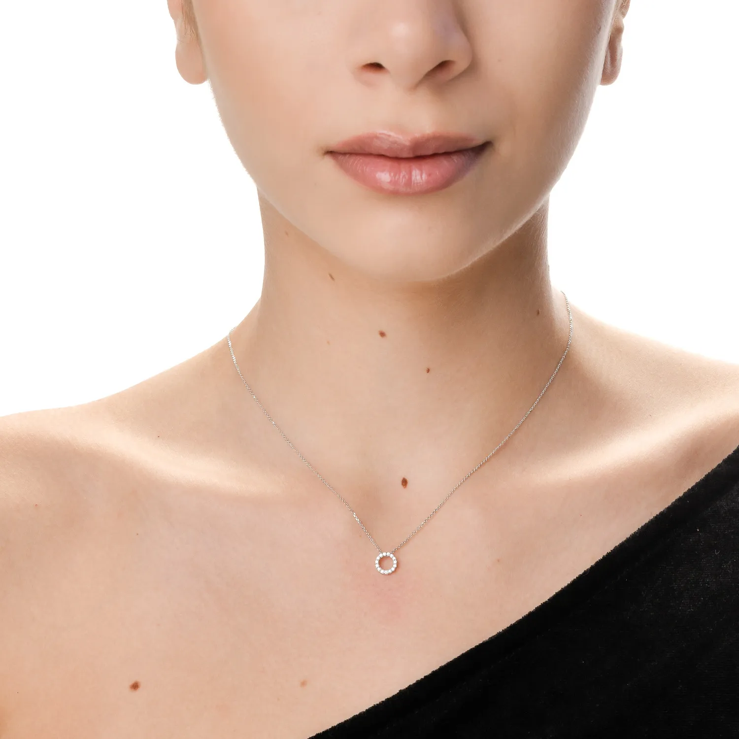 Forma circulara defineste acest lant din aur alb, cu pandantiv accentuat de zirconii dispuse uniform. Jocul de luminozitate pune in valoare conturul cercului si aduce un accent clar, potrivit unui stil actual. Este o bijuterie usor de purtat zi de zi, dar suficient de vizibila pentru a completa tinute mai elegante. Designul pastreaza un echilibru placut intre simplitate si expresivitate. Un detaliu modern, potrivit pentru orice moment. Descopera DAAR!