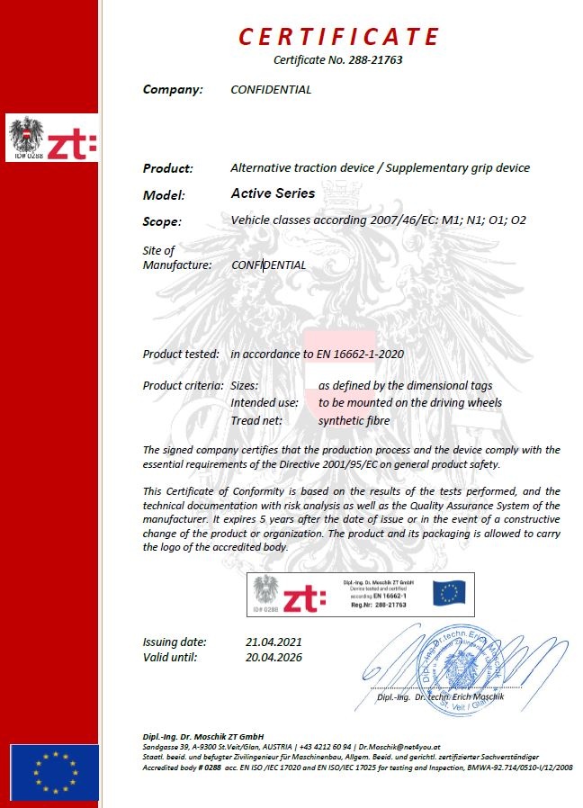 DAC Active Series, lanturi auto textile, huse antiderapante pentru masina ta Omologate conform standardului EN 16662-1:2020, husele antiderapante textile DAC Active Series 3D respecta cerintele europene de siguranta si performanta, asigurand aderenta optima pe zapada si gheata. Proiectate pentru compatibilitate cu diverse tipuri de vehicule, acestea ofera o utilizare eficienta, fara a deteriora anvelopele, si sunt conforme cu reglementarile legale din intreaga UE. Practic, in tari precum Germania, Franta, Italia, lanturile auto metalice pot fi inlocuite de husele antiderapante. Husele antiderapante de zapada DAC Active Series te ajuta in momentele in care sezonul de iarna iti face probleme cu aderenta cauciucurilor masinii. Husele antiderapante de la DAC sunt omologate, certificate si testate pentru siguranta folosirii in circulatia europeana. DAC Active Series este o solutie eficienta tip lanturi auto textile care se monteaza pe cauciucurile autoturismului atunci cand zapada sau poleiul iti afecteaza aderenta rotilor. DAC Active Series este compatibil cu mai multe variante de autoturisme precum SUV-uri sau masini 4x4, dar si masini de oras, berline ori compacte. Husele antiderapante de la DAC lucreaze eficient impotriva zapezii si a ghetei aflate pe suprafata carosabila. DAC Active Series, solutia antiderapanta eficienta Folosind DAC Active Series veti obtine o aderenta sporita in sezonul de iarna pe orice suprafata cu zapada sau gheata. Husele antiderapante de la DAC sunt construite special si testate pe diverse suprafete cu gheata sau zapada. Pachetul de produs al Dac Active Series contine 2 x huse antiderapante, husa impermeabila de protectie si manusi pentru instalarea produsului pe cauciucurile masinii. Montaj rapid si usor cu DAC Active Series DAC Active Series se monteaza in aproximativ 2 minute si emuleaza perfect profilul anvelopelor conferind aderenta deplina. Instalarea huselor antiderapante DAC se face pe rotile care ofera cea mai mare tractiune pentru autoturism. Husele DAC pot fi spalate de mana si curatate in maximum 30 de minute si sunt usor de transportat sau stocat. DAC Active Series nu provoaca deteriorare cauciucurilor si nu dau vibratii sau sunete nefamiliare in mers. Producatorul sfatuieste folosirea acestor huse cu o viteza maxima de 30 de km/ora pe suprafete cu gheata sau zapada. Material de fabricatie: polipropilena, cu 25% mai rezistente decat seria de huse antiderapante DAC Easy GO. LISTA COMPATIBILITATE DIMENSIUNI DE ANVELOPE/CAUCIUCURI (Consultati inainte de a achizitiona produsul) Lanturile se potrivesc pentru urmatoarele dimensiuni de anvelope: 13 14 15 16 17 18 19 20 21 22 23 24 25 26 X-Small 135/70 R13 135/70 R14 185/45 R15 135/80 R13 145/65 R14 145/60 R13 165/55 R14 145/65 R13 165/60 R14 145/70 R13 175/50 R14 155/65 R13 185/50 R14 155/70 R13 195/40 R14 165/55 R13 195/45 R14 165/60 R13 195/50 R14 165/65 R13 215/40 R14 165/70 R13 175/50 R13 175/55 R13 175/60 R13 185/55 R13 185/60 R13 195/45 R13 195/55 R13 Omologarea EN 16662-1:2020 reprezintă o standardizare europeană pentru echipamentele antiderapante utilizate pe drumurile acoperite cu zăpadă sau gheață, cum ar fi lanțurile textile, lanțurile metalice sau alte dispozitive similare. Aceasta garantează că produsele respectă cerințele tehnice și de siguranță stabilite de Uniunea Europeană. Iată ce implică această omologare: 1. Siguranță și Performanță Standardul verifică eficiența produselor în condiții reale de utilizare, asigurând că acestea oferă aderența necesară pe suprafețe alunecoase fără a compromite siguranța șoferului sau a vehiculului. 2. Compatibilitate cu Vehiculul EN 16662-1:2020 include cerințe privind modul în care dispozitivele antiderapante interacționează cu roțile vehiculului. Se verifică dacă: Nu afectează sistemele de frânare (ex. ABS, ESP). Nu deteriorează anvelopele sau jantele. 3. Calitate Materiale Materialele utilizate trebuie să fie rezistente la uzură, să nu deterioreze suprafețele carosabile și să fie sigure pentru utilizator. 4. Ușurință în Instalare și Demontare Standardul specifică și că echipamentele trebuie să fie ușor de montat și demontat, chiar și în condiții dificile (frig, zăpadă, gheață). 5. Conformitate Legală în Europa Dispozitivele care au omologarea EN 16662-1:2020 sunt acceptate legal în toate țările din Uniunea Europeană, inclusiv în zonele unde utilizarea echipamentelor antiderapante este obligatorie în sezonul de iarnă. Pentru produsele omologate conform acestui standard, clienții pot fi siguri că achiziționează un produs de înaltă calitate, potrivit cerințelor europene de siguranță și eficiență.