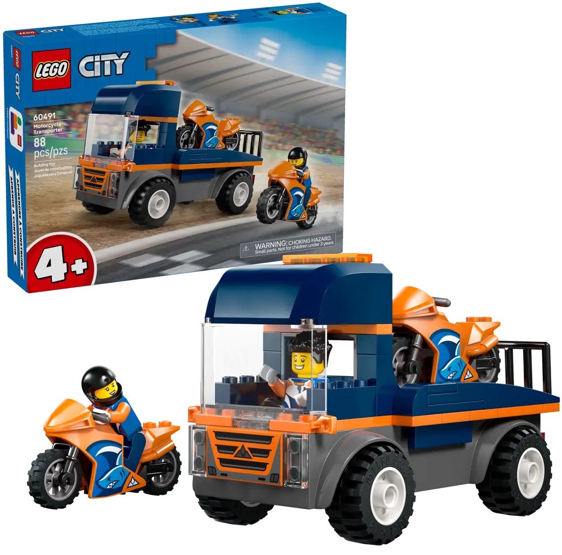 Ofera-le copiilor de 4+ ani un prim pas in joaca fantezista cu setul LEGO® City Transportor de motociclete (60491). Acest set de vehicule de jucarie include un camion platforma cu anvelope robuste din cauciuc, 2 motociclete sport si 2 minifigurinepiloti, fiecare cu casca. Copiii pot incarca si descarca motocicletele folosind rampa, pot recrea actiune epica de curse pe doua roti si pot aseza o minifigurina in cabina pentru aventuri distractive pe sosea. Acest set de joaca usor de construit inclu de un element LEGO Starter Brick, un ghid ilustrat simplu si instructiuni 3D in aplicatia LEGO Builder, un asistent digital pentru constructie, care le permit copiilor sa mareasca si sa roteasca modelele, astfel incat sa le poata vizualiza din orice unghi pe masura ce construiesc. Acest set este o surpriza grozava sau un cadou de ziua de nastere pentru fetele si baietii care iubesc jucariile de curse, joaca creativa si povestile fanteziste. Adauga aceste vehicule de jucarie la alte seturi de constructie (vandute separat) din gama LEGO® City pentru si mai multa actiune de curse. Setul contine 88 de piese.SET DE VEHICULE PENTRU COPIII DE 4+ ANI – LEGO® City Transportor de motociclete (60491) este un set ideal pentru incepatori, perfect pentru copiii de 4 ani si mai mari care adora camioanele si jucariile de curseCE GASESTI IN CUTIE – Include tot ce le trebuie copiilor pentru a construi un camion platforma de jucarie, 2 motociclete si 2 minifigurine piloti, pentru joaca plina de imaginatie si povesti creativeJUCARII PENTRU JOACA DE ROL – Copiii pot aseza o minifigurina in cabina camionului platforma si pot atasa rampa pentru a incarca si descarca cele 2 motociclete de jucarieACCESORII PENTRU JOACA – Acest set de vehicule de jucarie include accesorii LEGO® pentru minifigurine, ideale pentru joaca fantezista, precum o cheie, o cana si un smartphoneIDEE DE CADOU CU MOTOCICLETA PENTRU COPII – Sarbatoreste ziua de nastere sau orice alta ocazie speciala cu acest set de vehicule de construit, potrivit pentru fetele si baietii de 4 ani si mai mariORASUL TAU, FARA LIMITE – Copiii se pot bucura de si mai multa distractie atunci cand adauga acest set la alte seturi (vandute separat) din gama LEGO® City VehiculeO MANA DE AJUTOR PENTRU MICII CONSTRUCTORI – Include un element LEGO® Starter Brick, un ghid ilustrat simplu si instructiuni digitale 3D in aplicatia LEGO BuilderDIMENSIUNI – Camionul platforma din acest set de constructie cu 88 de piese masoara peste 8 cm in inaltime, 14 cm in lungime si 7 cm in latime