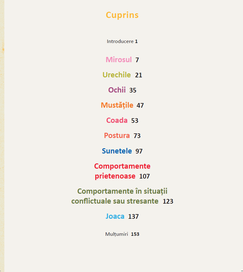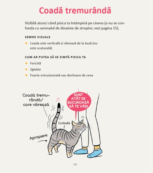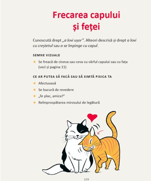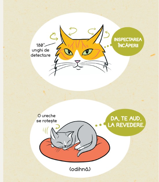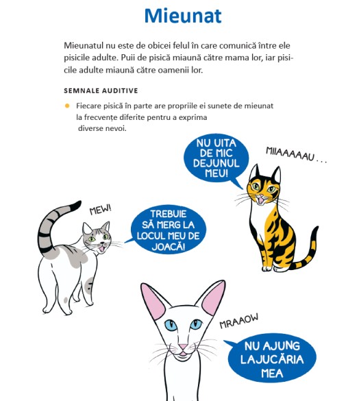 Stiai ca: atunci cand pisica ta are urechile cat se poate de orientate spre exterior, aceasta nu se simte relaxata? Sau cand pisica isi impinge crestetul capului in tine, aceasta isi exprima afectiunea, nevoia de atentie sau spune „tu esti prietenul meu”?Aceste comportamente (si multe altele!) sunt explicate si ilustrate in detalii viu colorate pentru a te ajuta in cresterea pisicii tale, sa se simta protejata, in siguranta, stimulata si fericita.Bazata pe cercetari si verificata de catre experti in comportamentele animalelor si de catre doctori veterinari, cartea Limbajul pisicilor este lectura potrivita pentru cei care stiu ca pisica face legea.