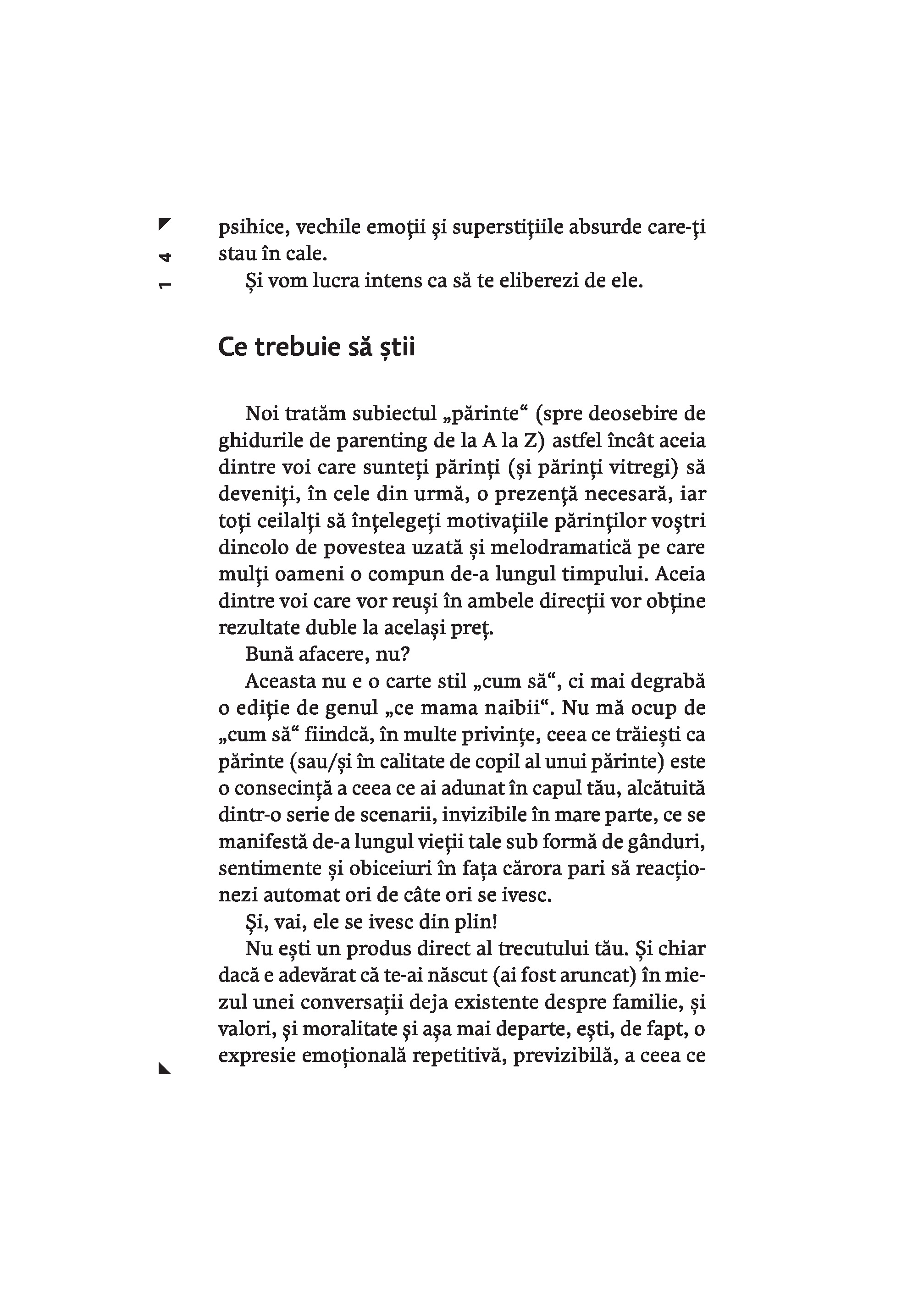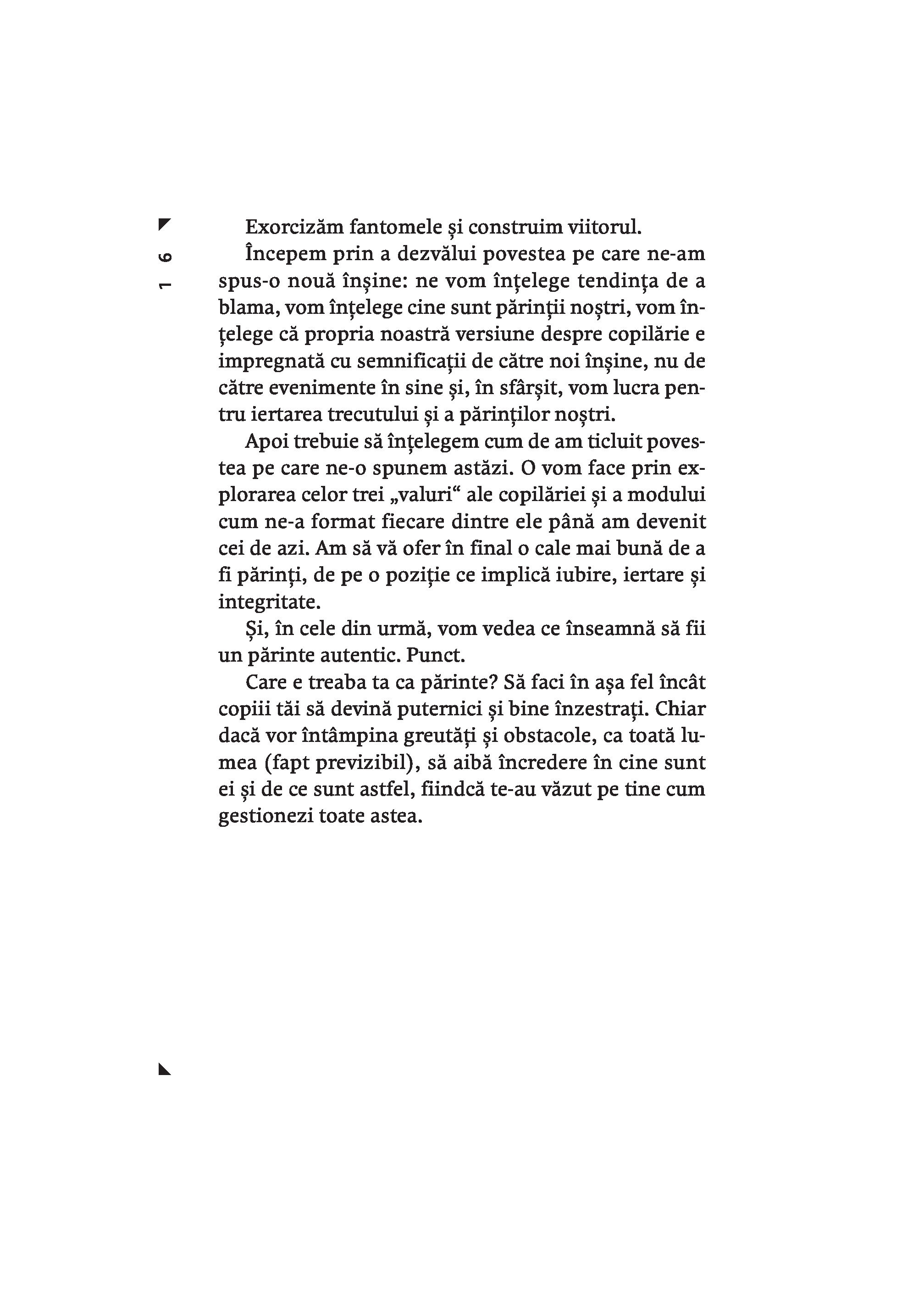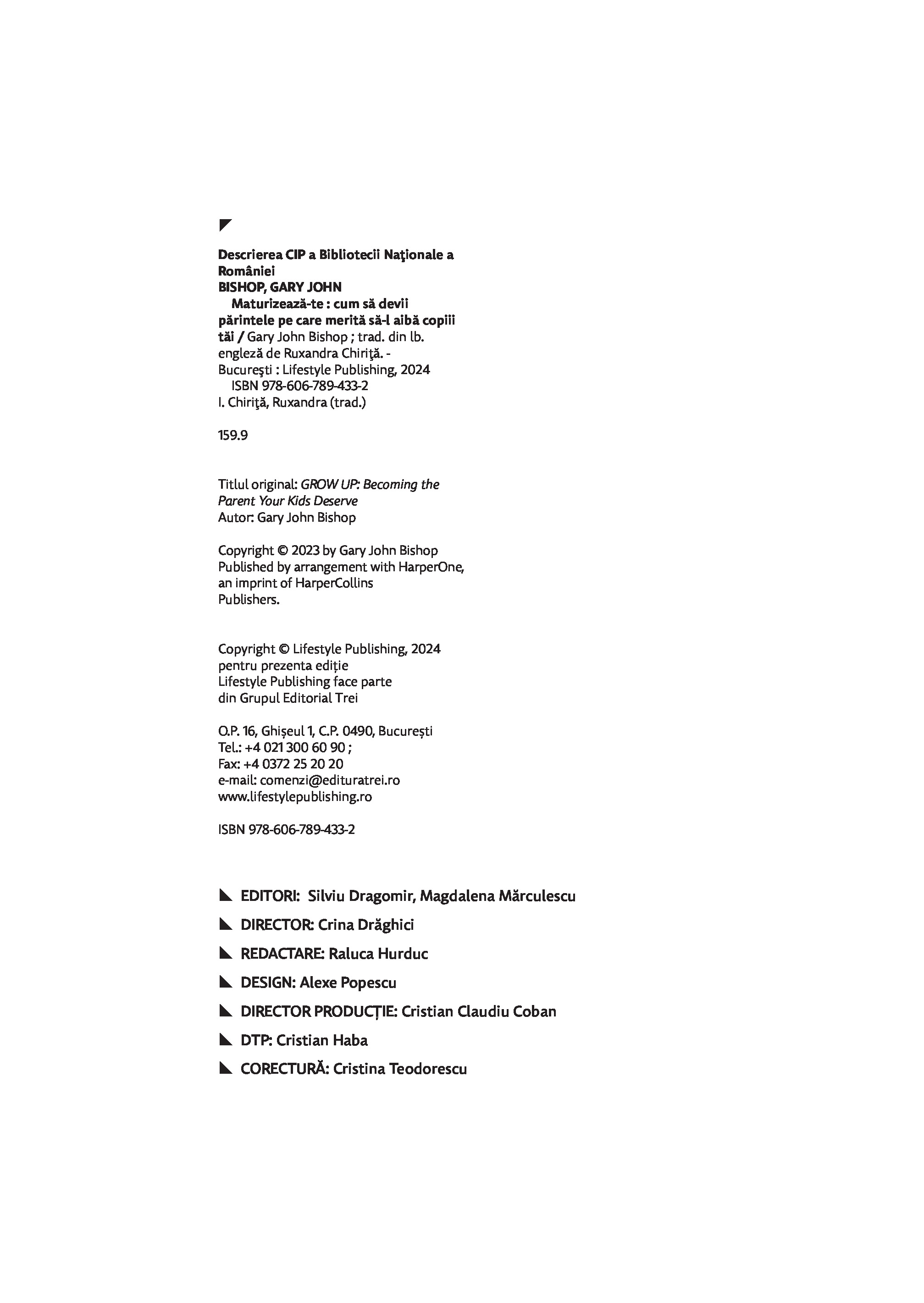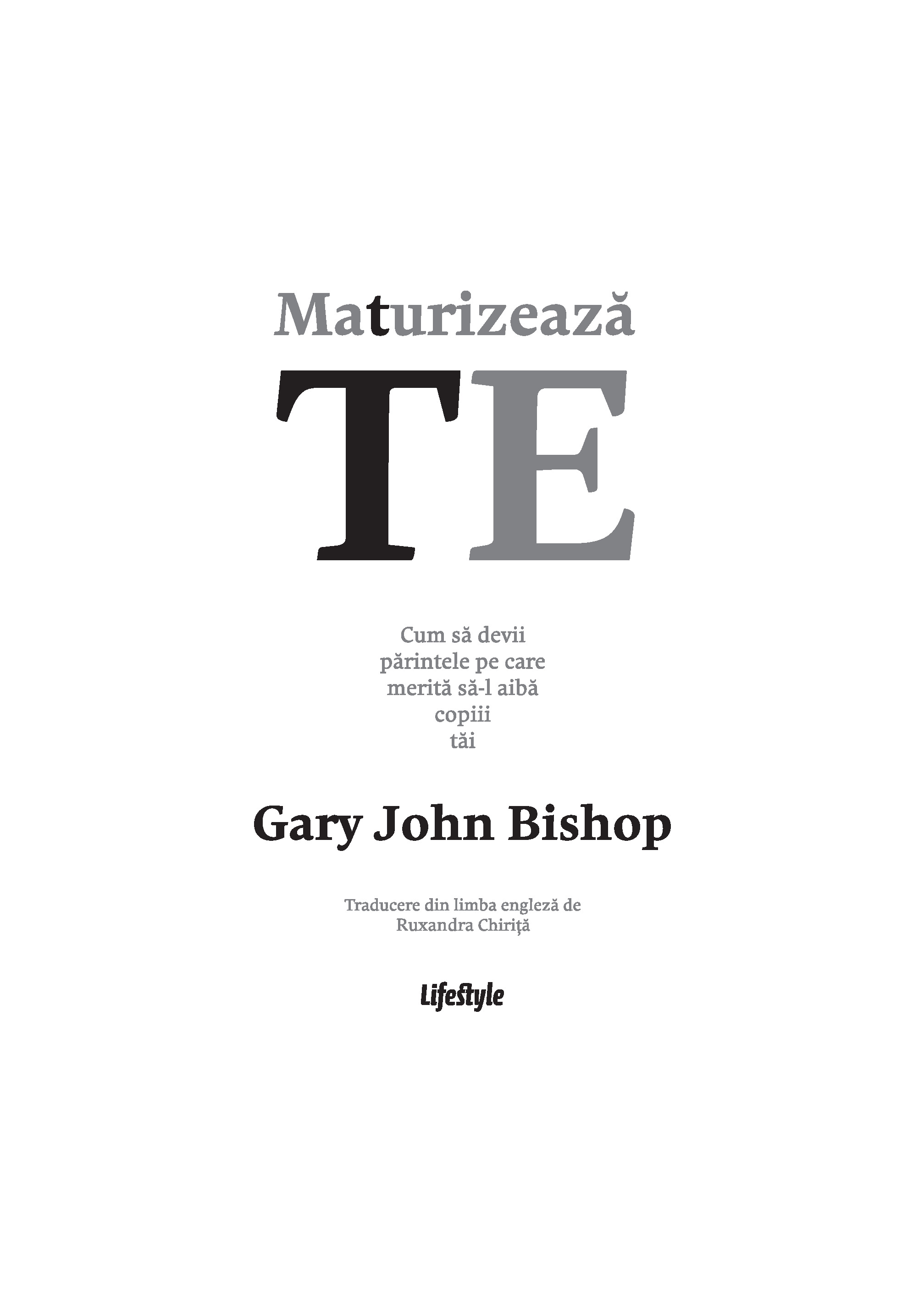 Maturizeaza-te este o carte din care invatam cum sa depasim teama ca nu suntem „parinti buni”, ca sa putem detine controlul in tot ceea ce facem si sa-i indrumam si pe copiii nostri sa-si asume responsabilitatea pentru deciziile din viata lor. Gary John Bishop a ajutat milioane de oameni sa renunte la autosabotare. El ne demonstreaza ca, in parenting, nu avem nevoie de secrete din batrani, de trucuri sau tehnici-minune; trebuie doar sa ne revizuim viata, ca sa intelegem cine suntem. Nu ne vom ridica niciodata la inaltimea modelului de „parinte perfect” pe care ni l-am construit in minte – o versiune care combina imaginea parintilor nostri cu diverse idealuri culturale si opinii exprimate pe retelele sociale.Vrem sa fim parinti buni, dar trecutul ne trage inapoi. Daca te gandesti: „Nu pot fi un parinte bun, din cauza ca am avut o copilarie urata, parinti rai sau o experienta traumatizanta” – opreste-te! Renunta la toate aceste idei si incepe sa actionezi in prezent pentru a deveni persoana care isi creste copiii cu iubire, iertare si integritate. In acest fel, iti modelezi si iti inzestrezi copiii pentru a pasi plini de incredere in lume si a prospera.Fie ca esti parinte, vrei sa devii parinte sau pur si simplu ai parinti, cartea de fata scoate la lumina adevaruri esentiale despre cine esti si cum te prezinti lumii – de ele depinde capacitatea de a prelua total controlul asupra directiei vietii tale si a le arata copiilor cum sa-si urmeze propriul drum.Gary John Bishop este unul dintre expertii de prim rang din domeniul dezvoltarii personale. Abordarea sa de tip „filosofie urbana reprezinta noul val in transformarea personala pozitiva si arta de a trai, care asigura oamenilor rezultate miraculoase in ceea ce priveste calitatea vietii si performantele obtinute.