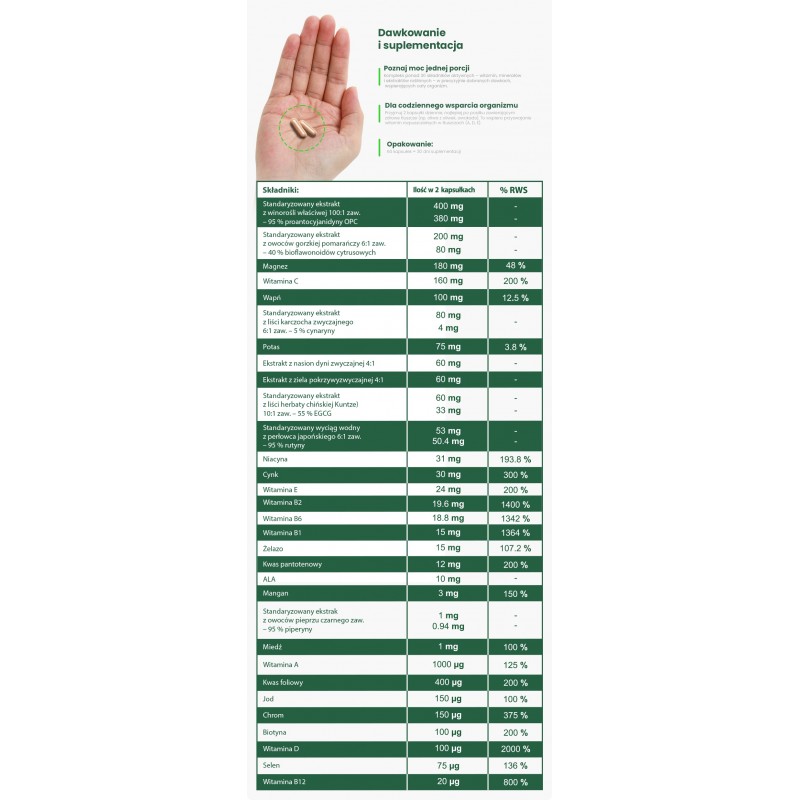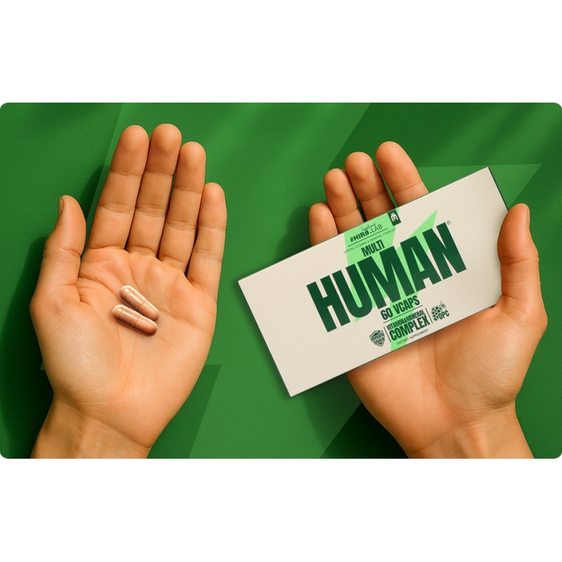 Multi Human - Multivitamine si Minerale - 60 Capsule, Hiro.Lab Conține 32 de ingrediente active, inclusiv vitamine bioactive, minerale chelate și extracte standardizate de plante. Susține funcțiile zilnice ale organismului – sistemul imunitar, metabolismul energetic, pielea, oasele, mușchii și concentrarea. Bazat pe cele mai biodisponibile forme – inclusiv metilcobalamină (B12), 5-MTHF (folat), K2 MK-7 și bisglicinat de fier. Conține antioxidanți naturali: coenzima Q10, astaxantină, luteină, licopen și resveratrol, care susțin protecția celulară împotriva stresului oxidativ. Potrivit pentru vegani, fără aditivi inutili – certificat ISO, GMP și HACCP. Dozaj: Luați 2 capsule pe zi, de preferință după masă. Eficiență ridicată datorită multivitaminei Multi Human Imediat ce te trezești, pe deplin motivat, mergi la un start-up de rutină? Te întorci, faci un duș rapid și mănânci micul dejun al campionilor? Suntem siguri că te simți în viață încă de la începutul zilei! Acum este timpul să lucrezi acolo unde faci tot ce poți. Ești un lider sau poate tocmai îți începi cariera? Știm că continui să mergi înainte. Sfârșit de lucru și mai este antrenament de seară? Sigur ca poti! Autodisciplina și regularitatea, precum și un stil de viață sănătos și o dietă de înaltă calitate te duc să fii în cea mai bună formă! Cu toate acestea, suntem conștienți că viața în plină desfășurare necesită un sprijin complet. De aceea vin în ajutor experții mărcii Hiro.Lab, care, după multe cercetări lungi și amănunțite, au dezvoltat complexul Multi Human de vitamine și minerale, sprijinindu-vă în drumul către vârf! Multivitamine pentru femei si barbati este un suport cuprinzator pentru intreg organismul! → Cu siguranță nu vă puteți nega lipsa tăgăduirii de sine și a motivației de a acționa – la urma urmei, determinarea sportivă începe cu adevărat din capul tău. Cu toate acestea, pentru ca organismul să țină pasul cu acest ritm rapid, reîncărcați-l cu cantitatea potrivită de vitamine și minerale. Multivitamine pentru sportivi Multi Human sub formă de capsule vegane vă va permite să completați necesarul zilnic de multe ingrediente active diferite într-o singură porție, fără a fi nevoie să luați suplimente separate pentru fiecare dintre micronutrienți. În comparație cu alte complexe de vitamine, cu Multi Human obțineți o doză foarte mare de ingrediente active de calitate excelentă. În plus, datorită formulei unice Immuno Shield, îți vei întări sistemul imunitar creând un scut imunitar care te protejează eficient împotriva virușilor și bacteriilor. → O doză completă de vitamine B contribuie la metabolismul energetic adecvat, susținând metabolismul și îmbunătățind eficiența gândirii. La rândul său, magneziul este responsabil pentru buna funcționare a mușchilor și conducerea impulsurilor nervoase și contribuie, de asemenea, la reducerea oboselii și oboselii. În complexul Multi Human, datorită dozei crescute de fier, vei furniza mai mult oxigen întregului tău corp, concentrația mare de mangan va susține funcționarea sistemului osos și a articulațiilor. Datorită combinației dintre un conținut ridicat de zinc și vitamina D, suplimentul are un efect foarte pozitiv asupra funcționării sistemului nervos, în timp ce vitamina D în sine este un excelent sprijin pentru imunitatea organismului. Calciul vă va ajuta să vă mențineți oasele și dinții sănătoși și puternici, ceea ce este, de asemenea, important în menținerea nivelului adecvat de hidratare și a echilibrului electrolitic. HIRO.LAB extracte de plante standardizate Natura a fost întotdeauna o sursă valoroasă de alimente și ingrediente benefice sănătății umane. În suplimentul Multi Human, aceste proprietăți benefice au fost incluse sub formă de extracte de plante de cea mai înaltă calitate, dintre care majoritatea sunt standardizate. Datorită acestui proces, obținem informații despre cât de multă substanță activă este într-un ingredient, ceea ce asigură o funcționare eficientă. În multivitaminele de la Hiro, găsim, printre altele, extract de portocală amară și frunze de anghinare, care susțin funcționarea sistemului tău digestiv, accelerează metabolismul și îmbunătățesc procesele digestive. Extractele de urzica si seminte de dovleac continute de Human au un efect benefic asupra functionarii sistemului urinar, in timp ce extractul de ceai verde sustine activitatea sistemului cardiovascular. Extract din semințe de struguri – Complexe oligomerice de proantocianidin Un alt ingredient natural al suplimentului Hiro, care are o serie de proprietăți de promovare a sănătății, este extractul de semințe de struguri, care conține cantități semnificative de compuși activi, numiți proantocianidine oligomerice (OPC). Este un suport multidimensional pentru organismul tau, in special datorita efectului sau puternic antioxidant, care previne dezvoltarea inflamatiei. Întărește-ți imunitatea cu Multi Human Hiro.Lab Multi Human este un fond de ten de neînlocuit cu care vei umple orice gol între ceea ce obții din alimente și ceea ce necesită stilul tău de viață activ. Deficiențele de vitamine pot provoca multe efecte nedorite, cum ar fi oboseala, scăderea formei și diferite tipuri de infecții. Acest lucru are un impact semnificativ nu numai asupra bunăstării tale, ci și asupra motivației tale de a-ți atinge obiectivele. Combinația de Zinc, Vitamina C și Rutină vă va întări sistemul imunitar, creând un scut imunitar. Ingrediente multi-umane: agent de încărcare – celuloză microcristalină, extract de struguri standardizat (Vitis vinifera L.) 100: 1 95% OPC proantocianidină, agent de gelifiere a cochiliei de celuloză – hidroxipropil metilceluloză, stabilizator – caragenan, regulator de aciditate – acetați de 