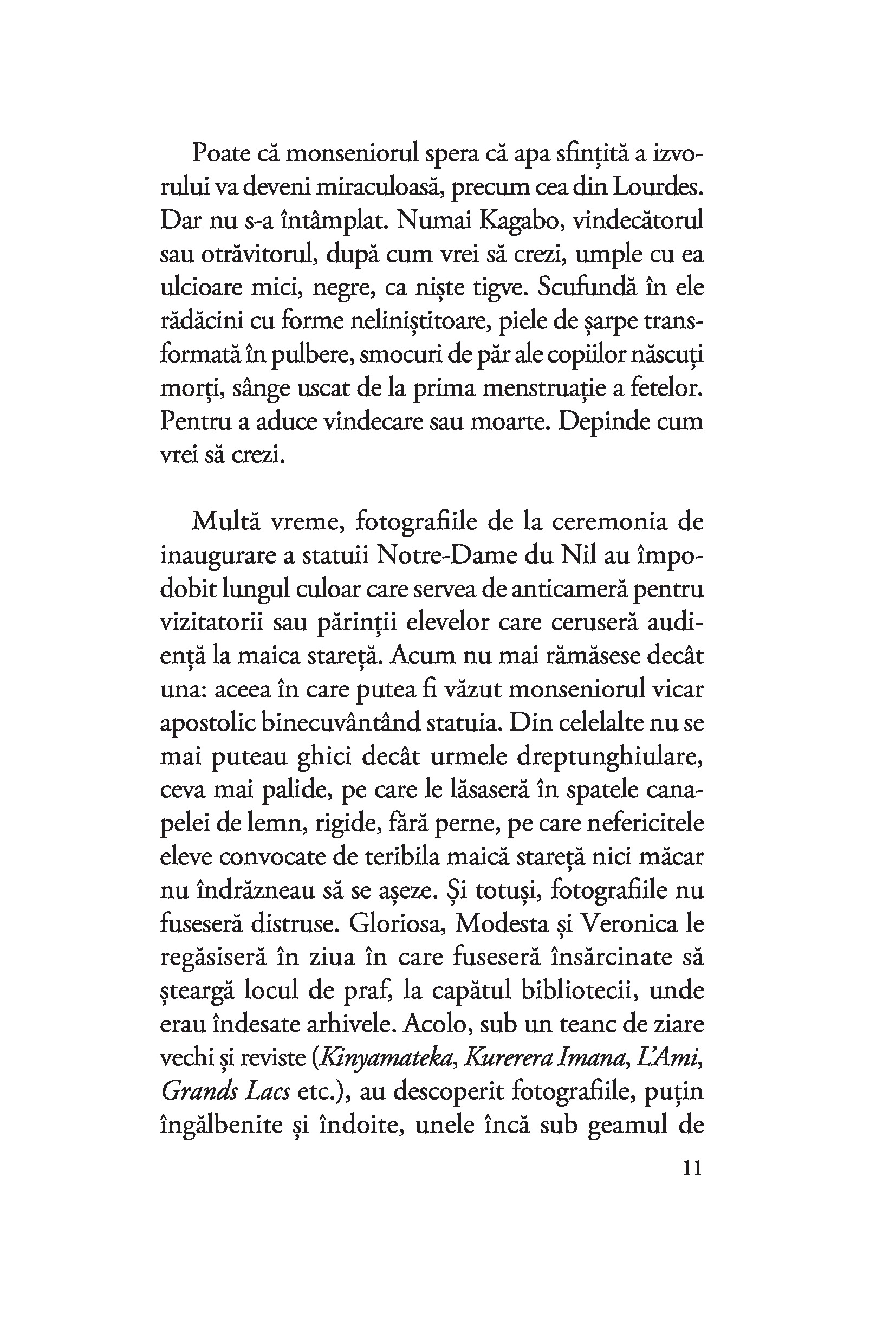 Roman distins in 2012 cu Prix Renaudot si Prix Ahmadou Kourouma, iar in 2013 cu Prix Oceans, Notre-Dame du Nil a fost ecranizat in 2019 de catre realizatorul Atiq Rahimi.In Rwanda, in anii ’70, un liceu de fete situat la 2 500 de metri altitudine, aproape de izvoarele Nilului, se ocupa de educatia tinerelor din familiile instarite. Parintii lor spera ca, in acest loc izolat – liceul catolic Notre-Dame du Nil –, aflat departe de tentatiile capitalei, fetele sa ramana pure, iar educatia primita sa le ofere un atu in plus in vederea „casatoriilor bune“ care le asteapta. Insa, in acest spatiu inchis si aproape exclusiv feminin, se petrec o serie de transgresiuni ce anunta – dincolo de conflictele inerente dintre adolescente – teribila tensiune etnica si politica dintre populatiile hutu si tutsi, ca un preludiu – taios si fara menajamente – la genocidul ruandez.