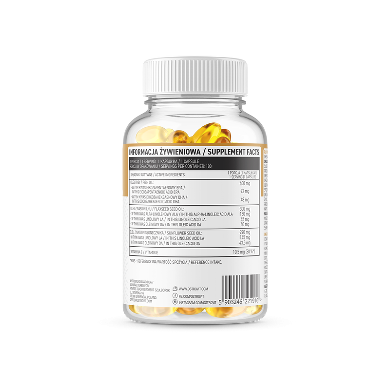 OstroVit Omega 3-6-9 180 Capsule - Mentine un nivel normal de colesterol - Ajuta la imbunatatirea activitatii sistemului nervos central - Sustine o mai buna functionare a membranei celulare a corpului nostru - Multe studii demonstreaza ca Omega 3 contribuie la reducerea trigliceridelor din sange - Are un efect antiinflamator - Blocul principal al membranelor celulare - Sustine imunitatea Omega 3-6-9 de la Ostrovit este un supliment alimentar pe baza de ulei de peste sub forma de capsule. Acizii omega-3 scad nivelul colesterolului rau (LDL), crescand astfel nivelul bun (HDL). Acestea reduc in principal trigliceridele. Cele mai importante dintre ele - DHA si EPA sunt elementele unice ale celulelor noastre. Datorita acestora, membrana celulara functioneaza mai bine, ceea ce imbunatateste toate procesele de viata de la conceptie. Ele cresc rezistenta corpului si sunt necesare pentru modelarea si activitatea creierului de la inceputul vietii fetale. Acizii Omega 6 sunt elementele de baza ale celulelor, sunt implicati in producerea multor hormoni, inclusiv neurotransmitatorii (conexiunile dintre celulele nervoase ale creierului) si ajuta la imbunatatirea activitatii sistemului nervos central. Acesti acizi sunt o componenta importanta a membranelor celulare si sustin imunitatea. Acizii grasi Omega-9 scad colesterolul total si cel rau (LDL) fara a scadea din cel bun (HDL). Acestea sunt elementele de baza ale fiecarei celule si ajuta la mentinerea tensiunii arteriale normale.Omega 3-6-9 a fost imbogatit suplimentar cu vitamina E, care ajuta la protejarea celulelor impotriva stresului oxidativ. Acest supliment este recomandat tuturor persoanelor care doresc sa-si imbunatateasca bunastarea si functionarea corpului. Utilizarea regulata a Omega 3 contribuie la imbunatatirea starii fizice si mentale a corpului. Prospect Omega 3-6-9: Mod de administrare: A se consuma 1 capsula pe zi, de preferat, dupa una dintre mesele principale ale zilei. Cantitate: 180 capsule, Servire: 1 capsula; Ingrediente: Ulei de peste, ulei de in, ulei din seminte de floarea-soarelui, umectanti – glicerol; apa; acetat de DL-alfa-tocoferil (vitamina E). Acest produs poate contine urme de lapte (lactoza), boabe de soia, alune, nuci, susan, ovaz, oua, crustacee. Informatii nutritionale: Per servire: Ulei de peste: 400mg - Include acid EPA 72mg - Include acid DHA 48mg Ulei din seminte de in: 300mg - Include acid alfa-linoleic (ALA) 150mg - Include acid linoleic (LA) 45mg - Include acid oleic (OA) 60mg Ulei din seminte de floarea soarelui: 290mg - Include acid linoleic (LA) 145mg - Includ acid oleic (OA) 43.5mg Vitamina E 10.5mg ATENTIE: Nu luati acest produs daca sunteti insarcinata sau alaptati. A nu se lasa la indemana copiilor. Nu utilizati daca sigiliul este rupt. A se pastra intr-un loc racoros si uscat. Nu folositi un supliment alimentar ca inlocuitor al unei alimentatii variate si echilibrate! Acest supliment alimentar nu este destinat sa diagnosticheze, sa trateze, sa vindece sau sa previna vreo boala.