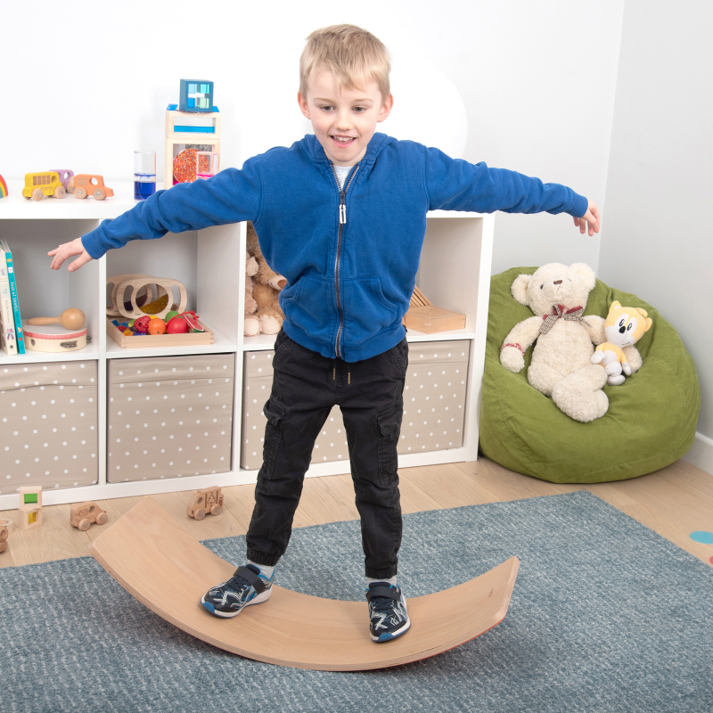 Cu o parte inferioar cptuit cu pacircsl vibrant, aceast plac de echilibru neted i robust din placaj de fag ofer o activitate distractiv i provocatoare pentru toate vacircrstele. Punacircnd picioarele